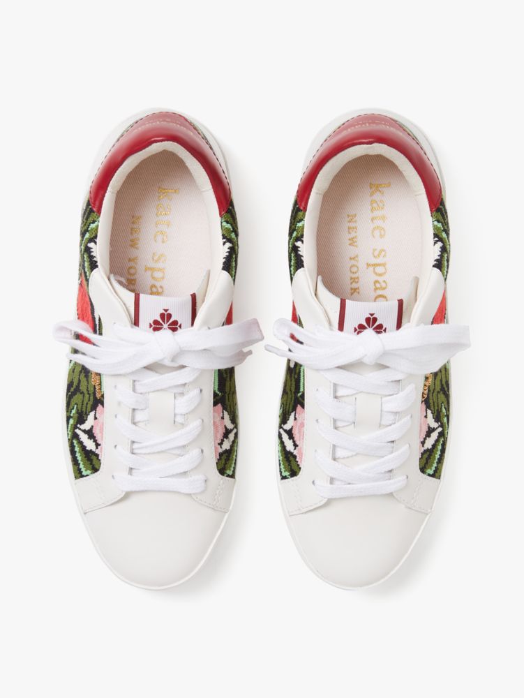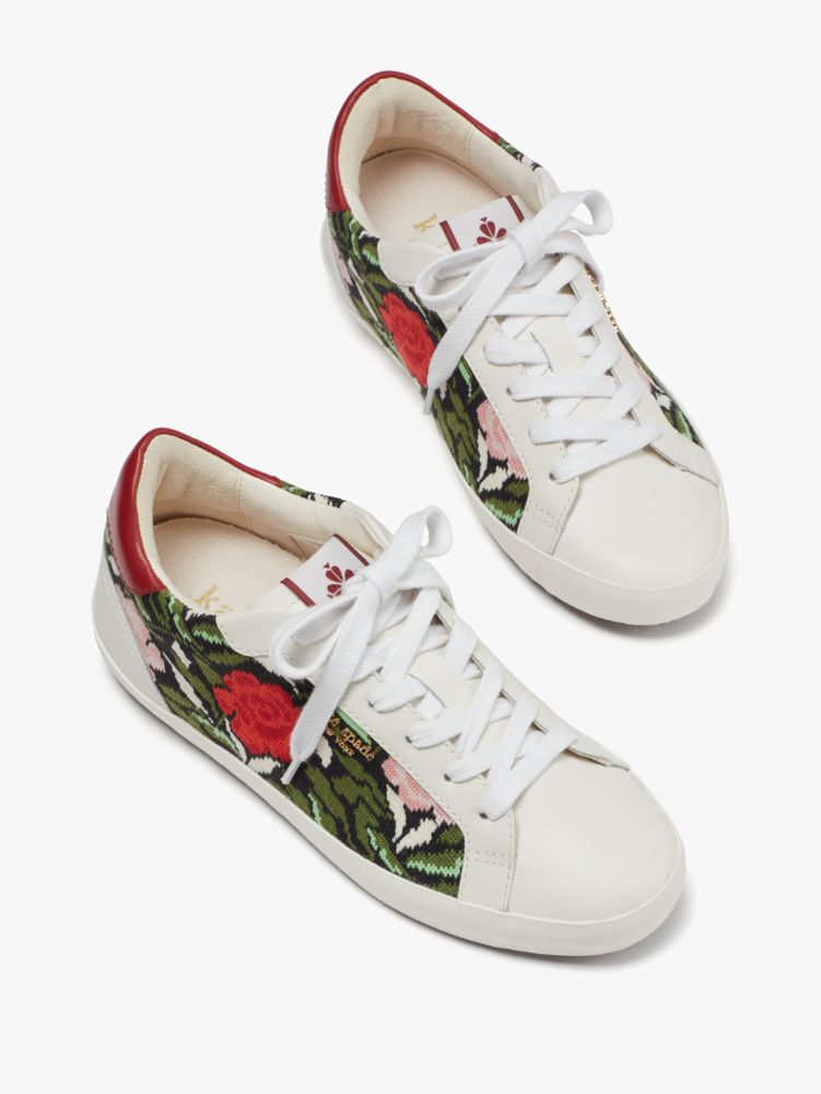 Bye bye, boring white sneakers. Trade in your plain Jane tennis shoes for these ones elegantly inset with rose garden needlepoint.