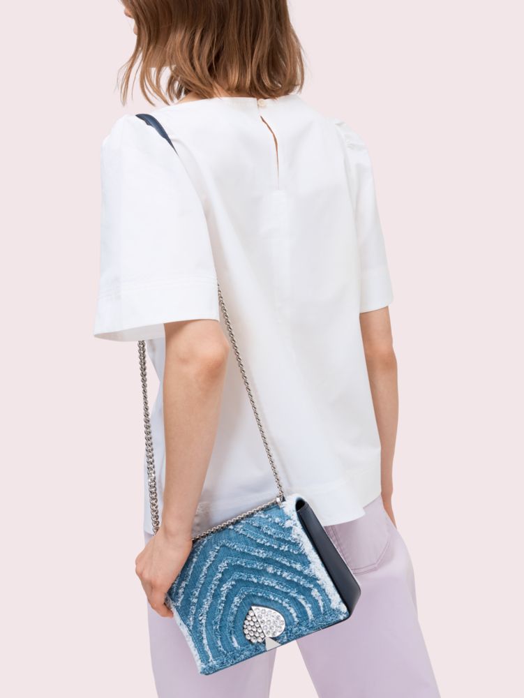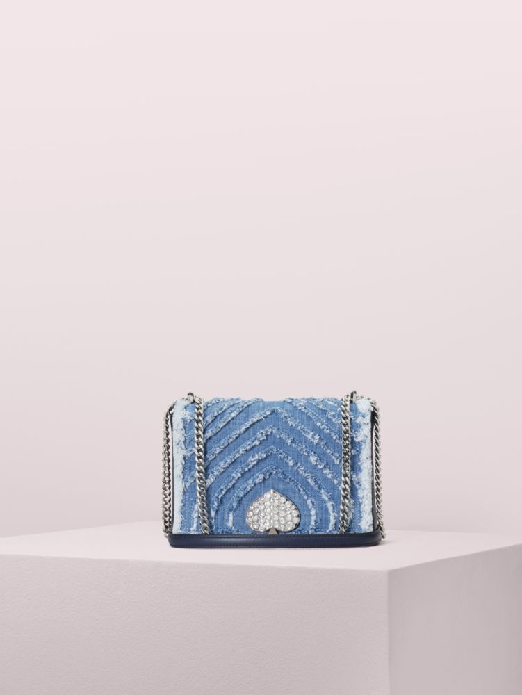 our amelia jeweled medium shoulder bag is crafted from smooth leather and denim we elevated with edgy frayed detailing. gently structured for everyday use, the bag’s strong silhouette is balanced with soft, feminine details like rounded corners and a refined chain strap that can be worn short or long. a zipper pocket inside keeps your essentials organized. and for the finishing touch? our iconic spade covered in crystals.