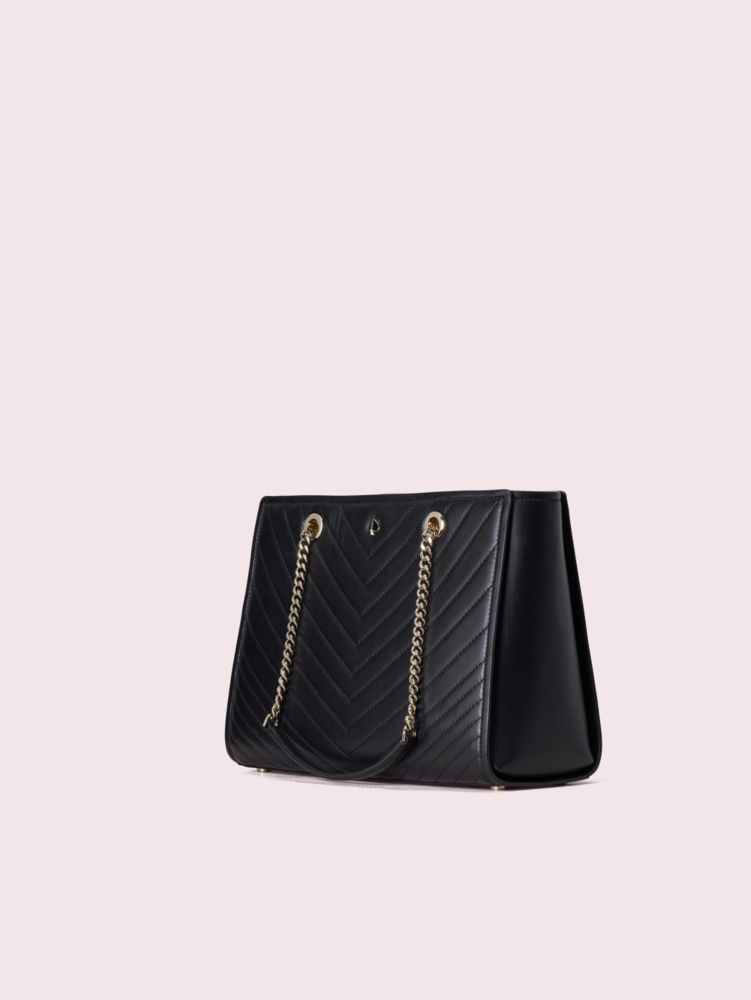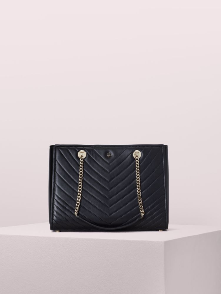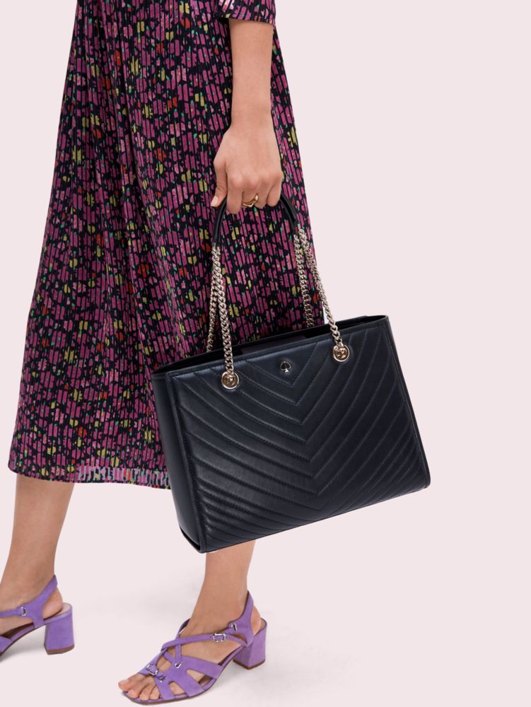 our amelia large tote is a true everyday bag that fits it all (it has a large zipper and three slide pockets to be exact). and with soft, feminine details like the rounded corners and refined chain straps, you'll never grow tired of carrying it. now for one of our favorite parts: the smooth lambskin leather is quilted in a concentric formation around our iconic faceted enamel spade (in case it wasn't radiant enough).