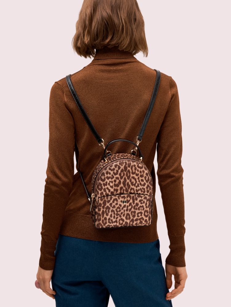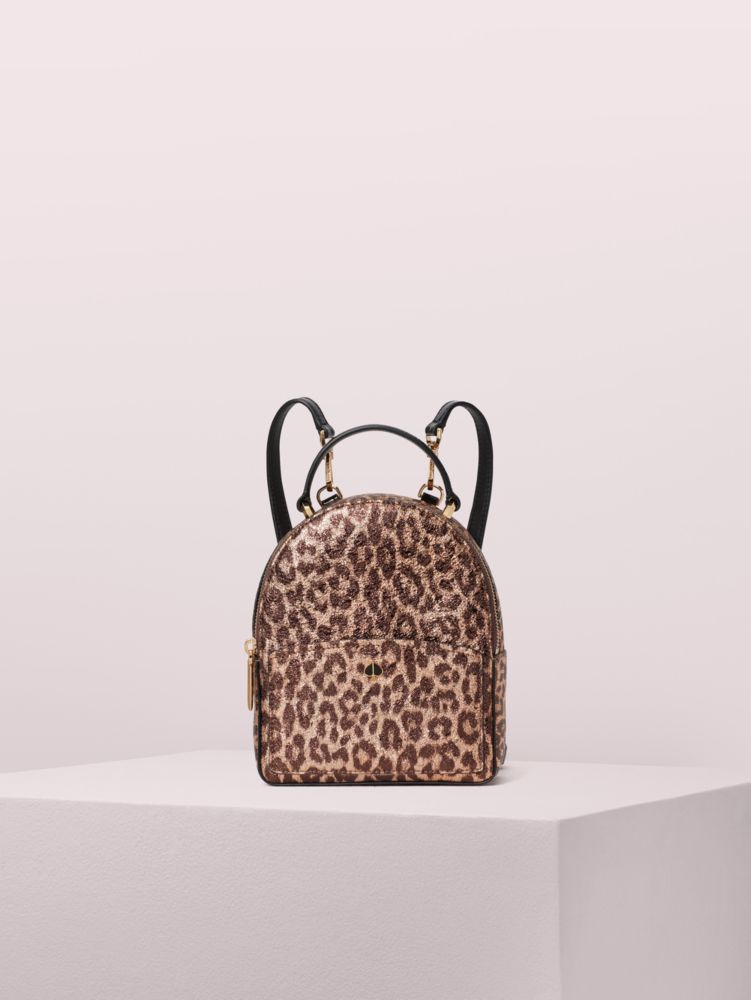 our amelia mini convertible backpack might be petite, but we designed it with big functionality. unzip the top and you'll find enough space for your phone, wallet, keys, chocolate-covered almonds...plus, an interior snap-tab slip pocket that holds both of your phones. (or anything else you prefer to keep inside.) adjustable shoulder straps come off so you can carry it by the top handle, like a handbag. attach one of those straps to each side and it's a crossbody. (and you know the third one.) it's crafted from metallic leopard-print italian leather punctuated with an enamel spade.