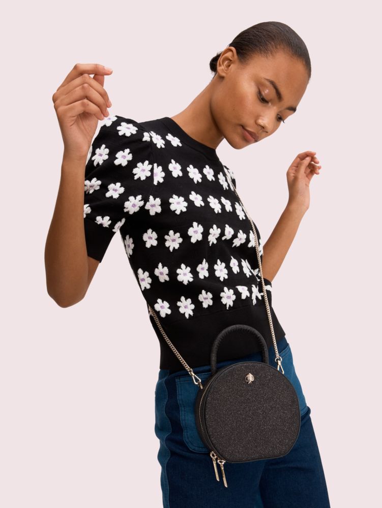 an extra special something for the one who's well rounded. we shrunk our andi canteen bag and covered it in glittery leather for a party-ready spin on the classic, hatbox-inspired shape. punctuated with an enamel spade detail, it features a top handle and includes an elegant chain strap that clips on and off. a double-zip closure opens to a snap-tab slip pocket and slots for your cards should you want to go wallet-free. the flat base ensures it sits pretty wherever you place it.