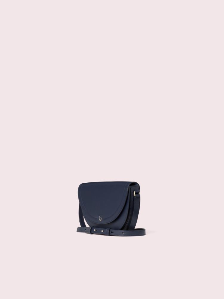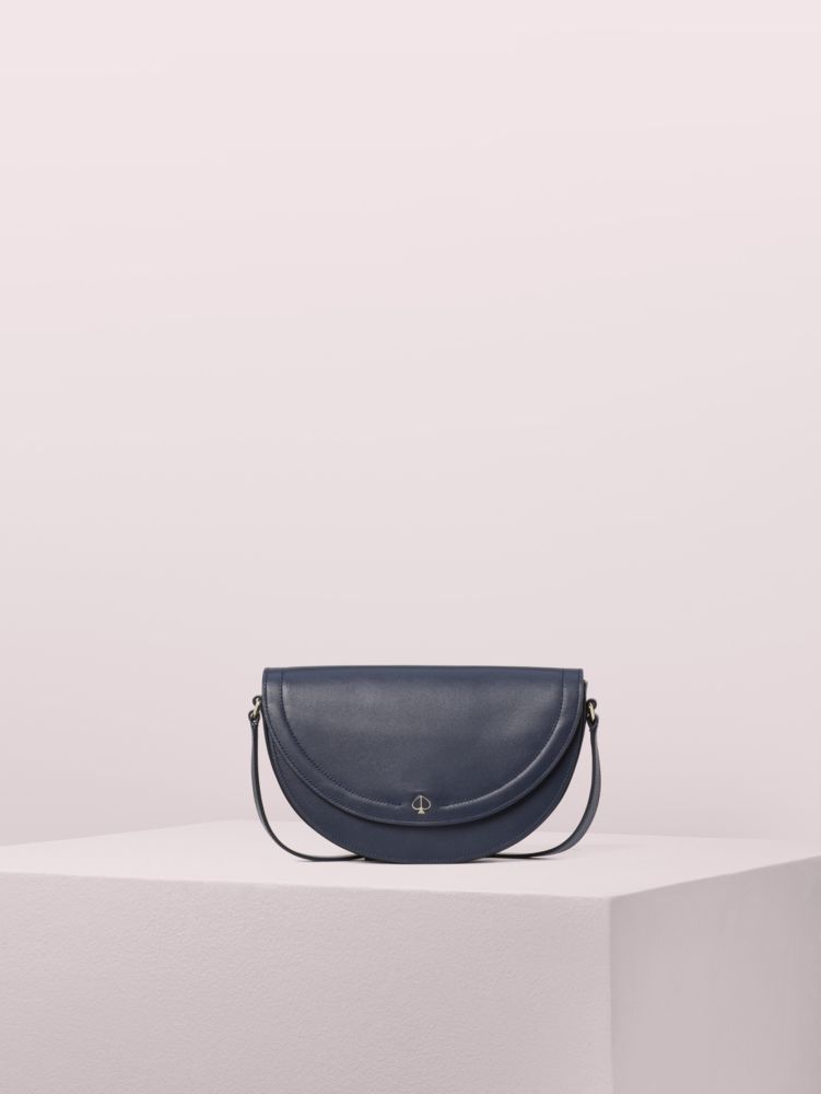 our andi half moon crossbody is a modern take on a classic silhouette. done in smooth italian leather with an enamel spade detail, it features an adjustable strap with beautiful, jewelry-like hardware. several pockets inside keep things organized, the plunge on the back slip pocket is a seductively subtle nod to the curves of our signature mark. contrast lining, a gold foil emboss logo and a snap closure are other understated details that make this little bag special.