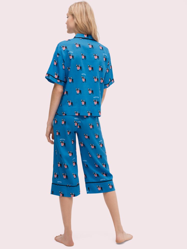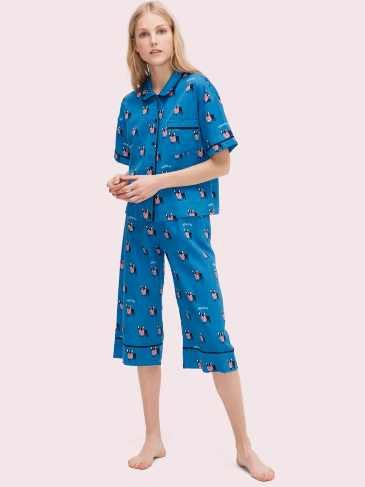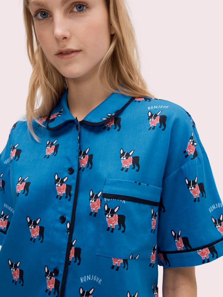 this cropped pj set with piping detail is inspired by men’s pajamas, but its capri pants and peter pan collar make it classic and feminine. it’s sprinkled with illustrations of our favorite bulldog for a little frenchie flair.