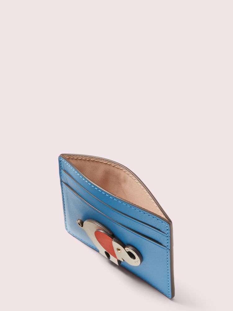 this is tiny. she's our charming little elephant you might have seen scattered throughout some of our accessories. we appliquéd her to this smooth italian leather cardholder for a playful spin on an everyday accessory. we also filled this slim style with plenty of slots for your growing card collection. (five, to be exact.)
