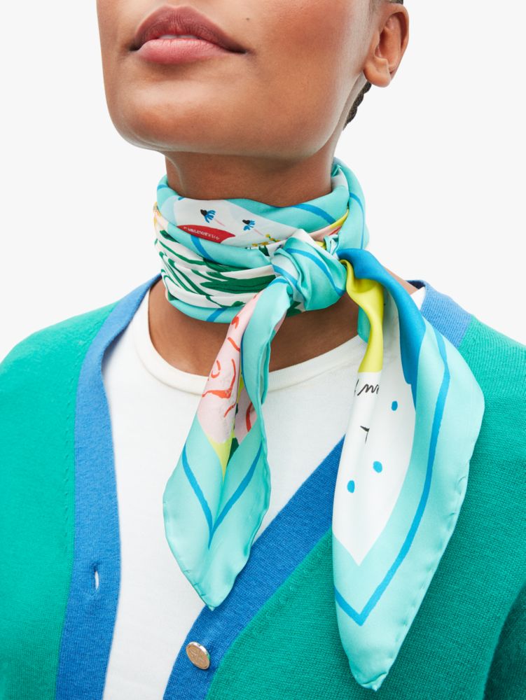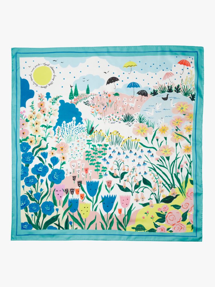 you know what they say about spring: april showers, may flowers... and even on those rainier days, this vibrant silk square scarf will brighten your spirits.