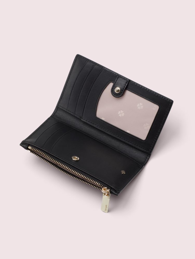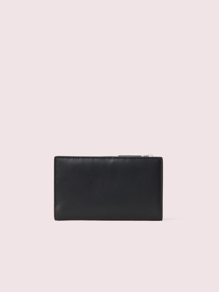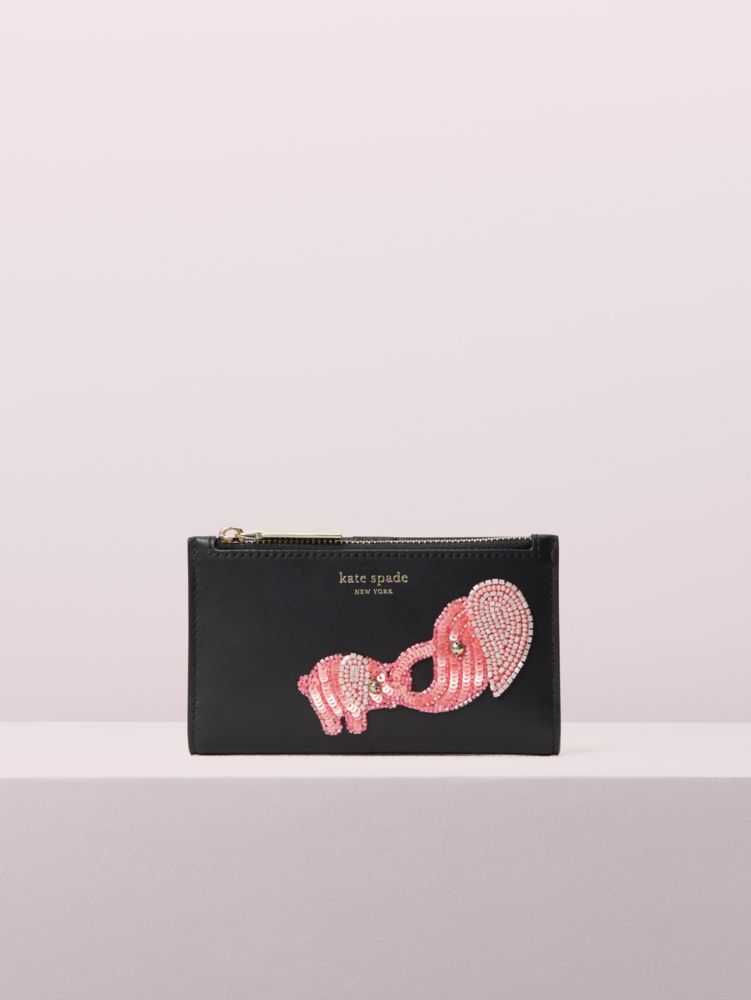 this is tiny. she's our charming little elephant you might have seen scattered throughout some of our accessories. we appliquéd her and baby tiny to this smooth italian leather bifold wallet in sparkly sequins and beads for a playful spin on an everyday accessory. we also filled this slim style with plenty of slots and pockets for your growing card collection.