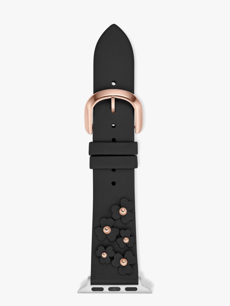 our black leather band features so many thoughtful details, like a rose gold-tone stainless steel buckle and double-sided leather floral appliqués that have been punctuated with rose gold-tone rivets. it's made use with Apple Watch® Series 1 through 6 and fits both 38mm and 40mm styles.