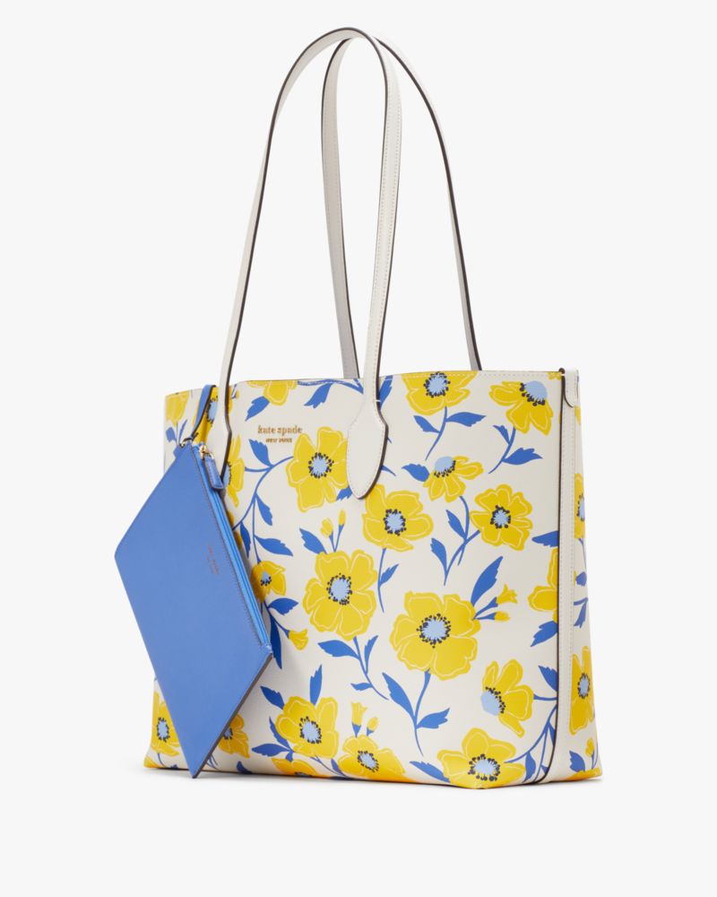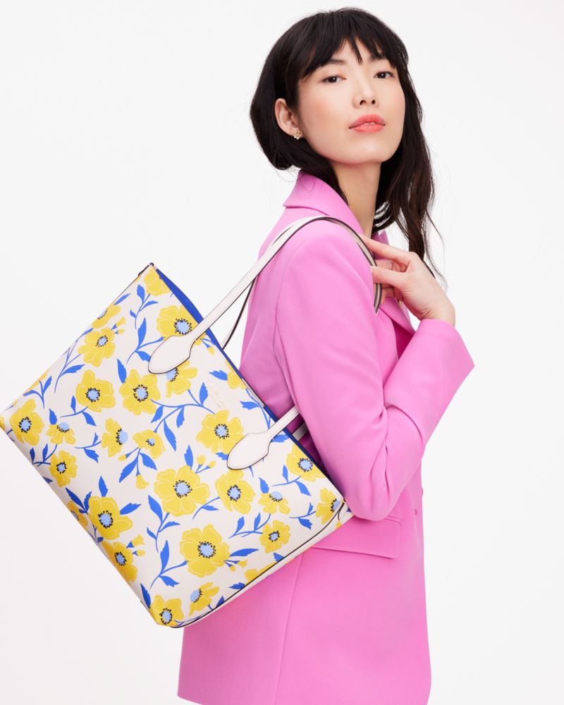 Elevate your 9-to-5 style with our new Bleecker tote. It's made from durable faux Saffiano leather in our Sunshine Floral print with plenty of room for your everyday essentials (including a 13" laptop).