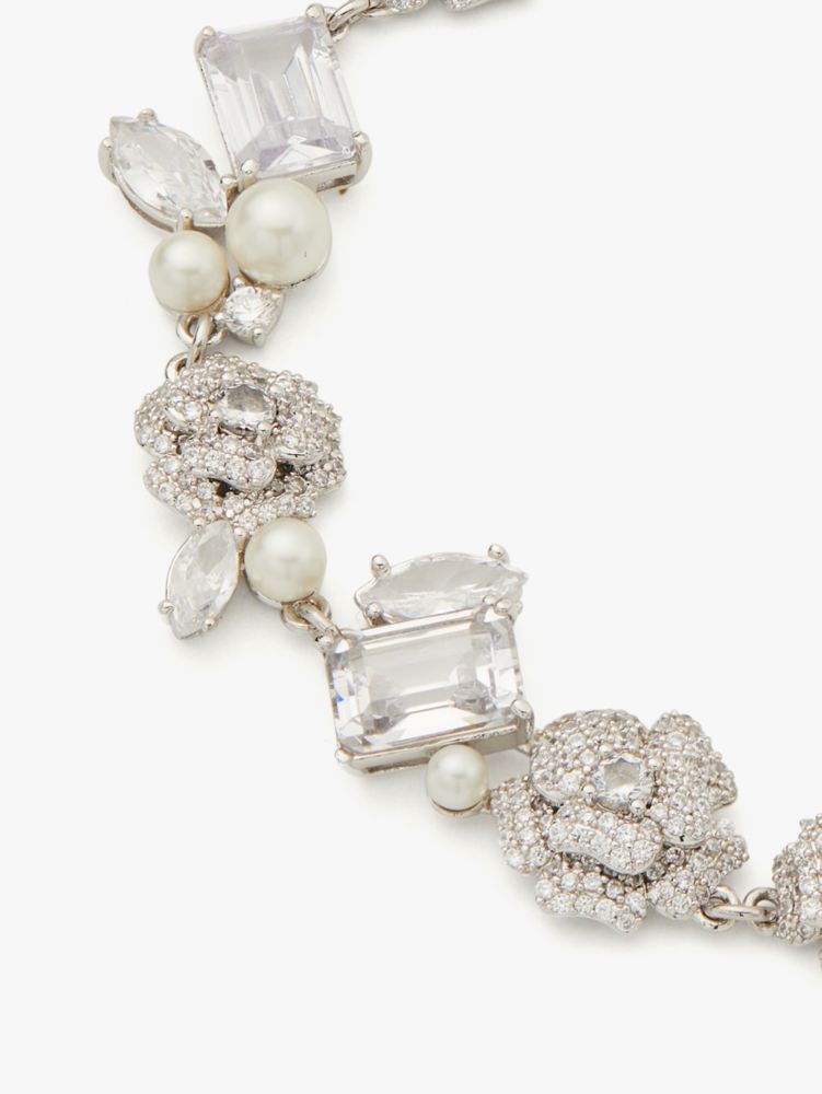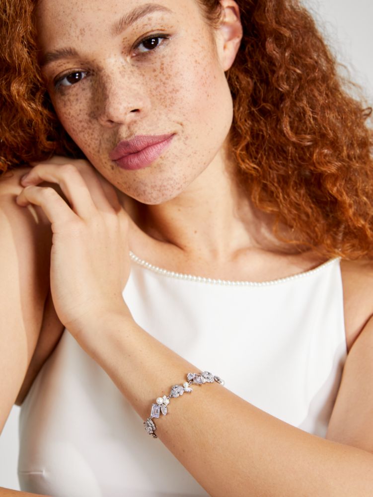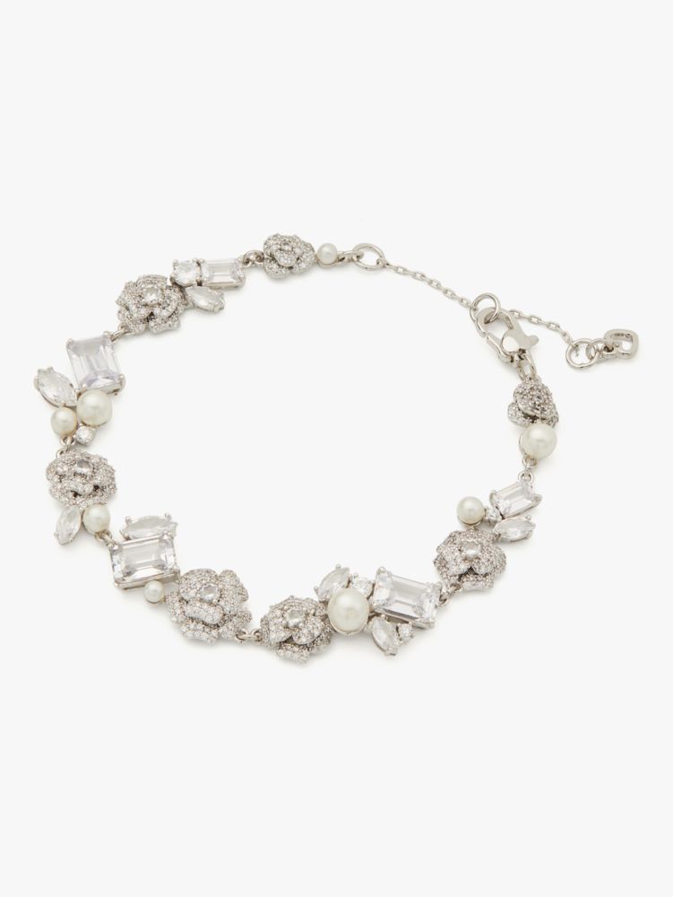 A special finishing touch for the bride-to-be: Toss the bouquet in that magical white dress and this line bracelet featuring sparkling roses, faceted gems and pearls to boot.