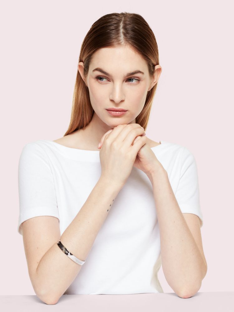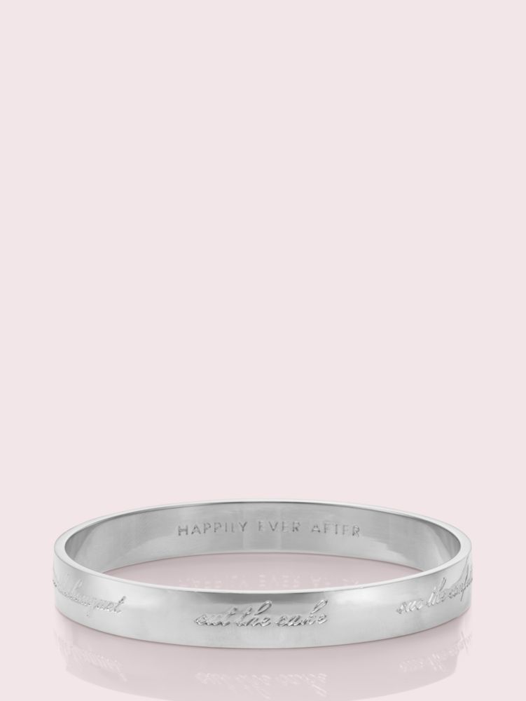 this sweet bangle was designed with the bride (and her party of a lifetime) in mind. it's delicately engraved with: cue the confetti, cheers!, kiss the bride, tie the knot, toss the bouquet, cut the cake.