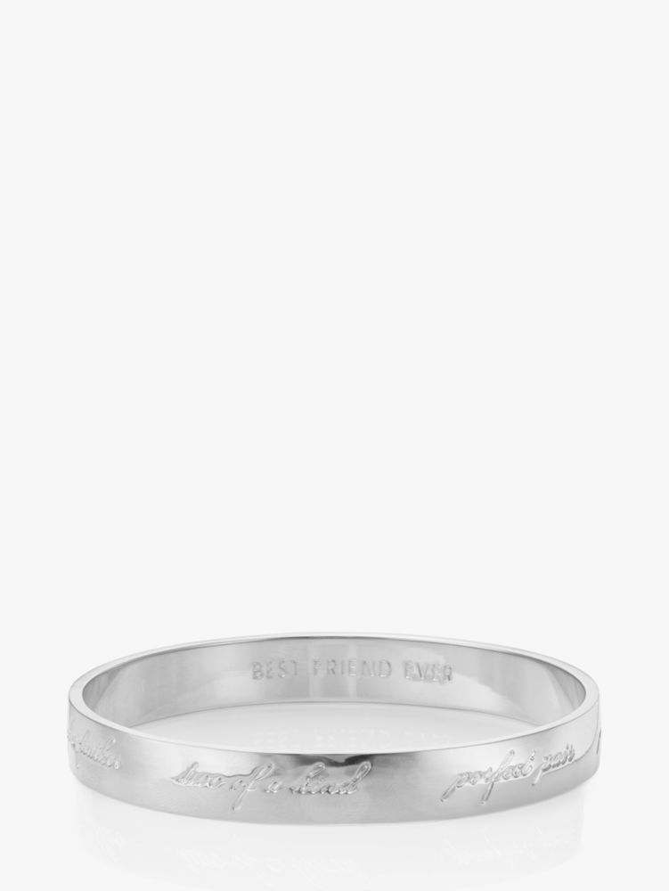 from staying in on a friday night to help you stuff wedding invitations to planning your parisian-themed bridal shower, we're sure you've got the best bridesmaids any girl could ask for. show them your thanks with this shiny bangle, sweetly engraved with a few of our favorite turns of phrase.