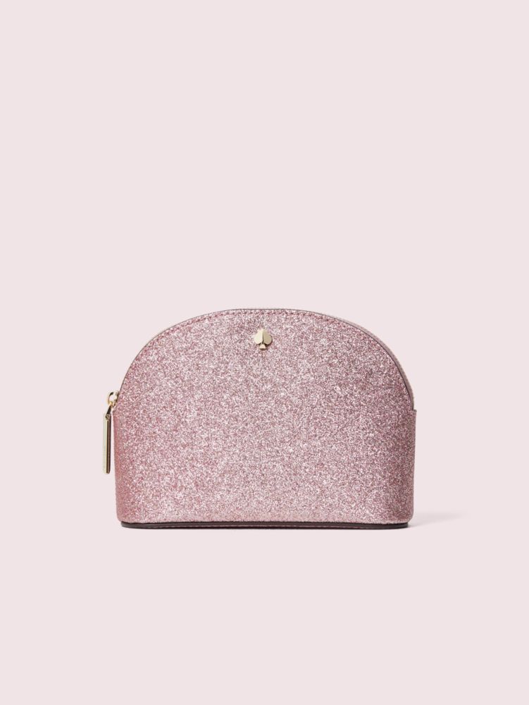 you know us--we've always had an affinity for sparkle, hence our burgess court collection we made of solid glitter fabric in dreamy jewel tones and pastels. this small dome cosmetic case, with our soft spade floral jacquard lining and a zip-top closure, gives you a safe (and mesmerizing) place to store mascara, eyeliner, lip gloss...you know the rest.