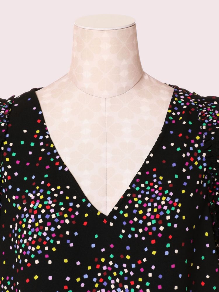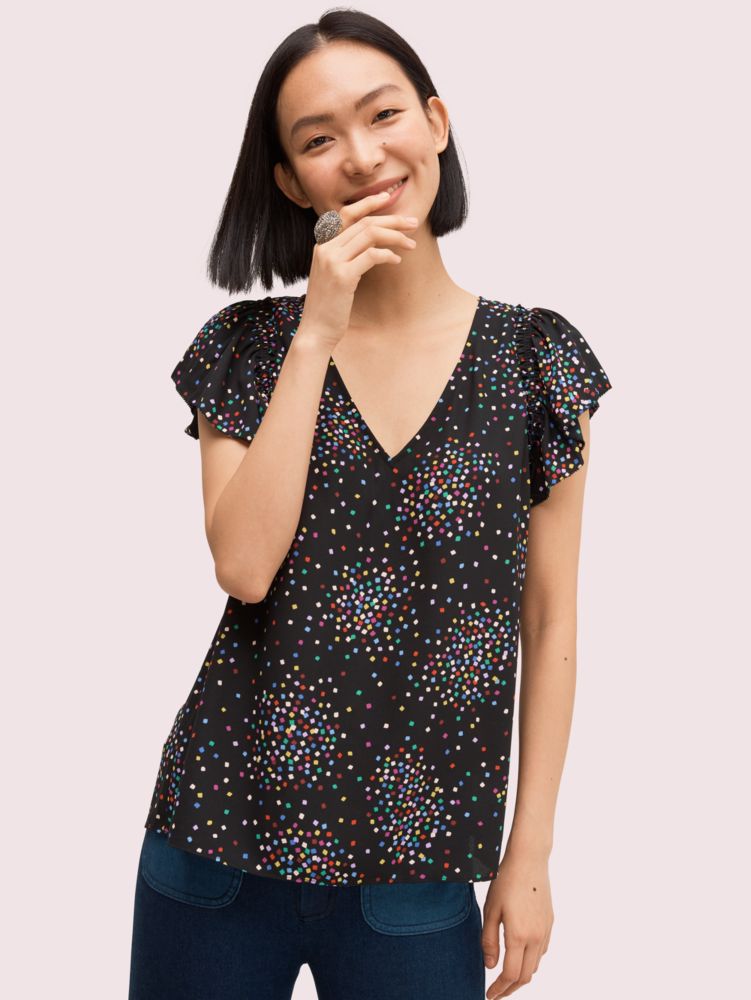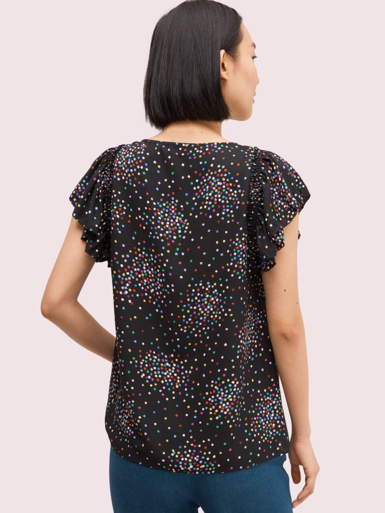 with celebration as our inspiration, we covered this crêpe de chine blouse with our vibrant confetti cheer print. the ruffled shoulders and flutter sleeves add to the playfulness of this party piece.