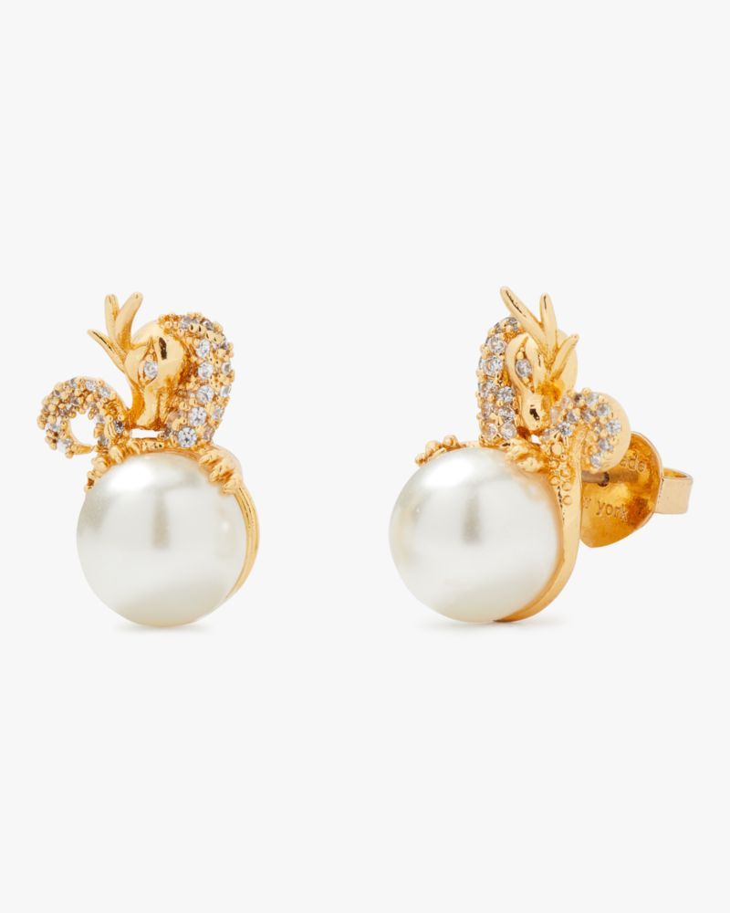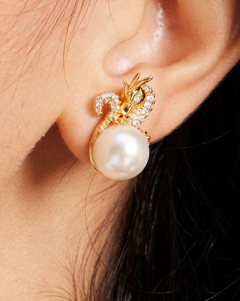 In celebration of Lunar New Year, these earrings showcase dazzling dragons set atop faux-pearl studs.