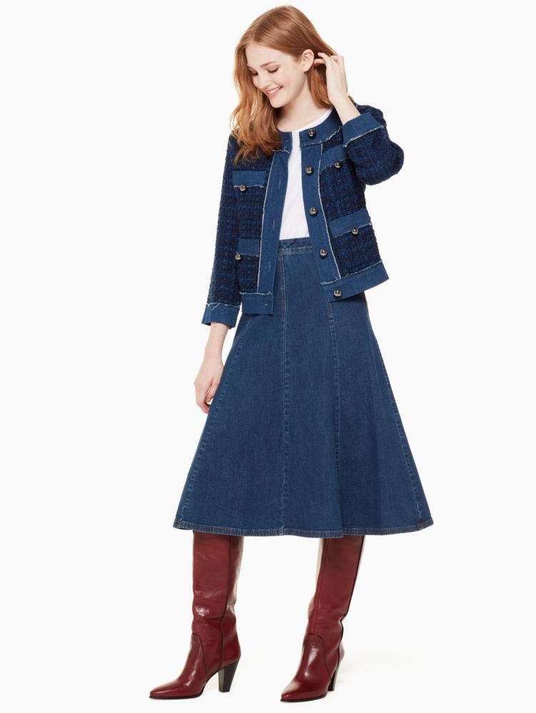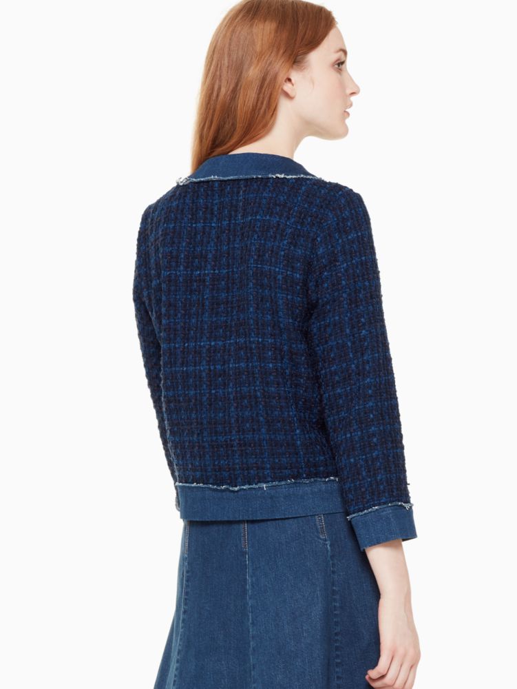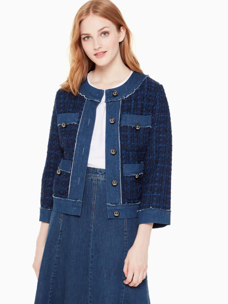 polished, but with a twist, our broome street tweed denim jacket epitomizes a ladylike look, but its frayed denim accents and oversized buttons lend a relaxed, modern feel (meaning it also pairs perfectly with jeans and a tee).