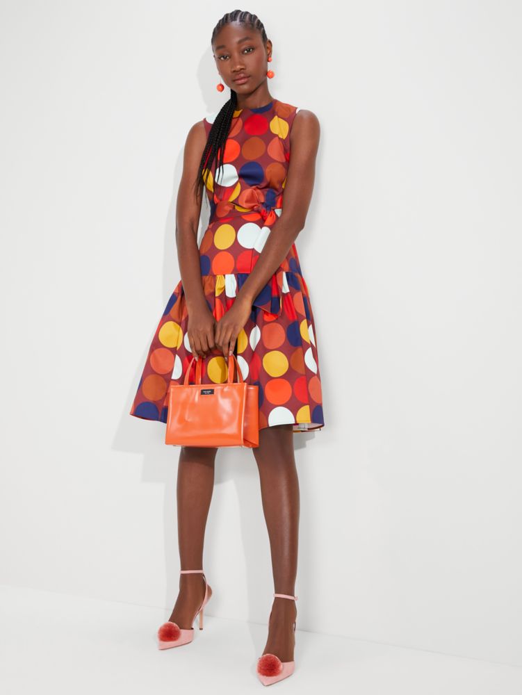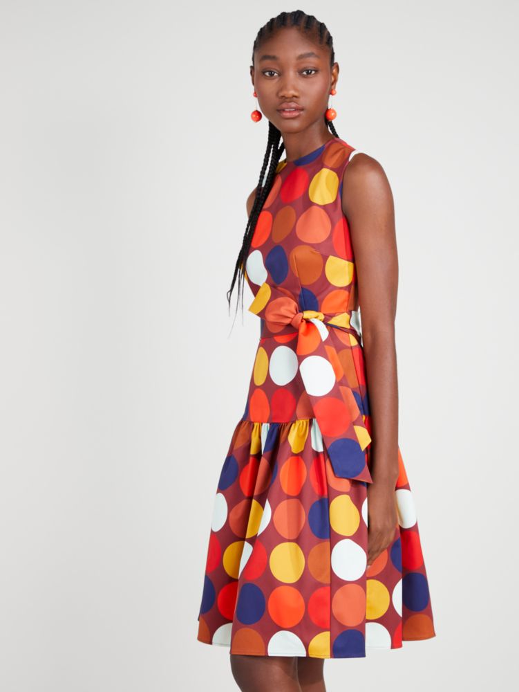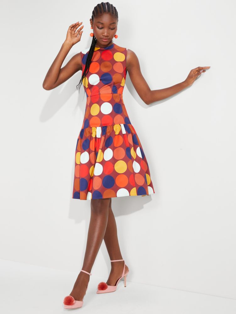Sixties chick: In this faille drop-waist dress detailed with modish multicolored dots, that's you.