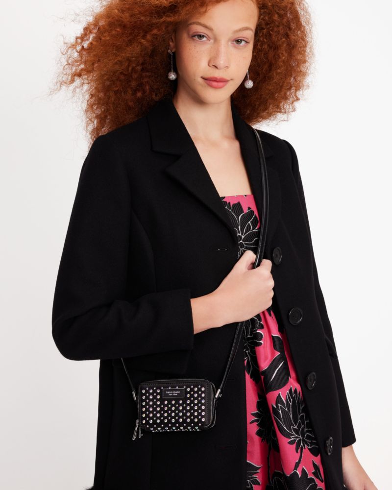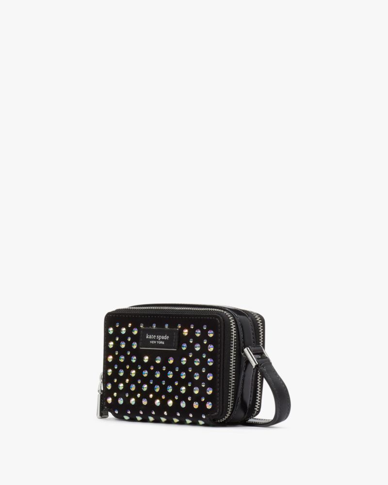 Made from smooth leather with sparkling crystal embellishments, our new micro crossbody holds your essentials in style.