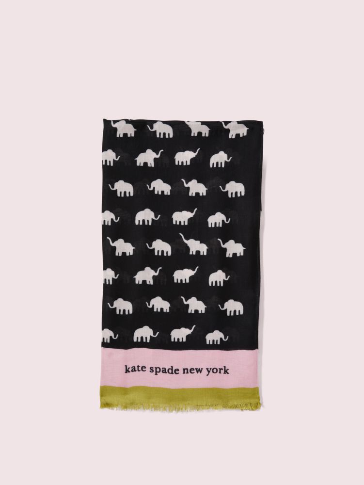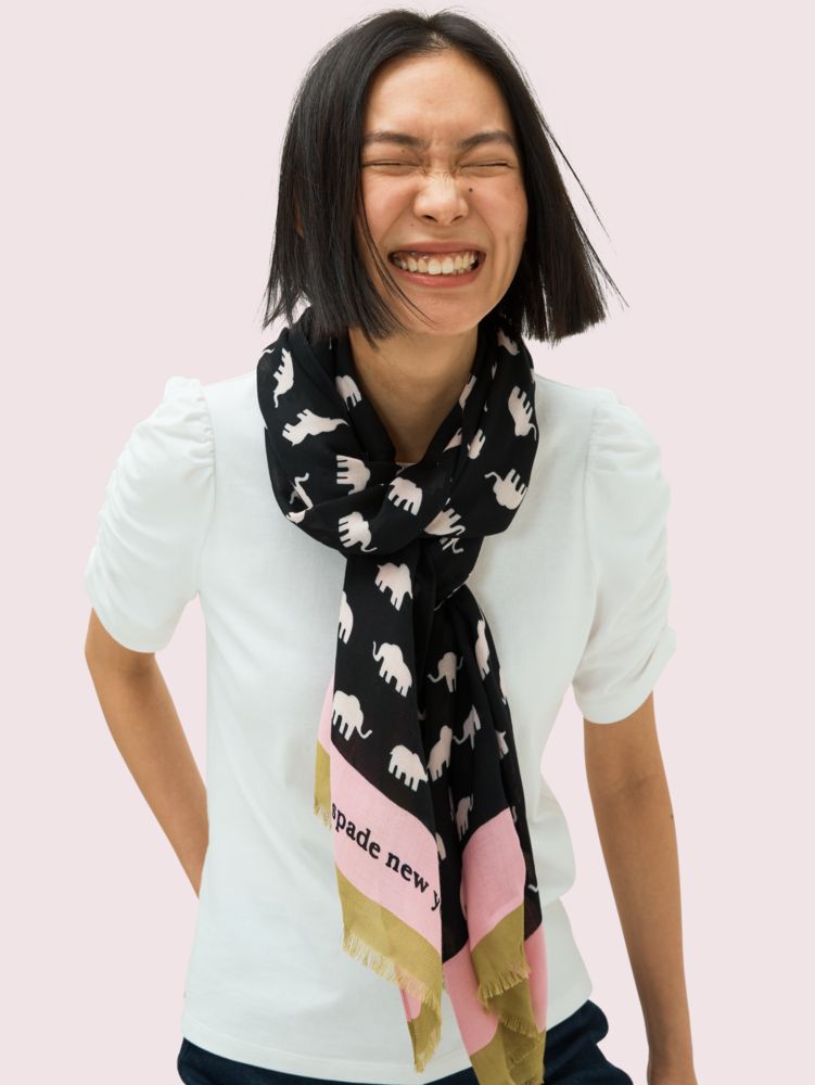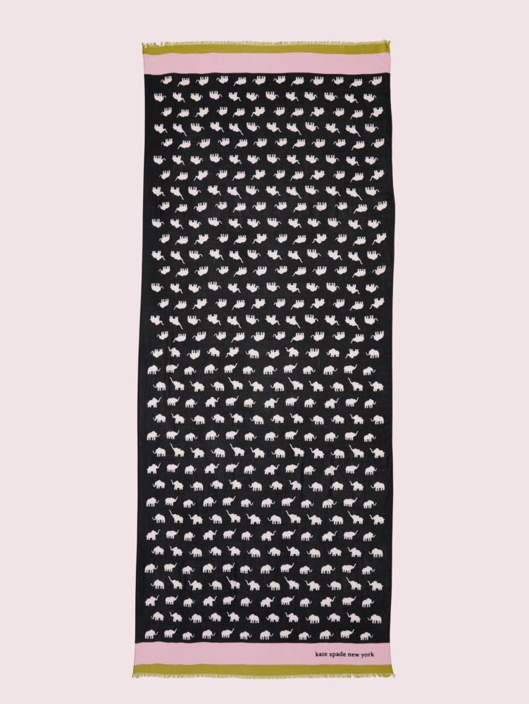 done in soft twill, this adorable scarf nods to the wise gentle giants of the rainforest. we pair the mini elephant motif with a striped border, and then add luxe details like baby hem sides, self-fringed ends, and our signature gold foil logo.