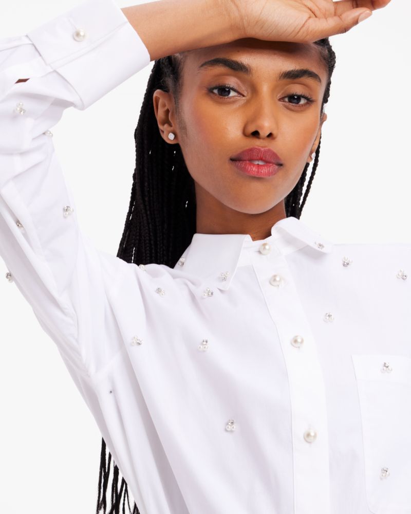 Kate Spade,Embellished Poplin Shirt,Spandex,Cotton,Button Down,Pearl,Rhinestones,Day Party,White