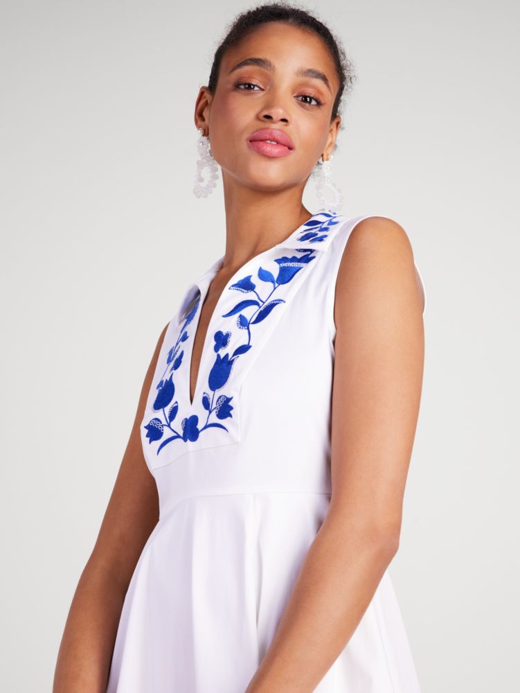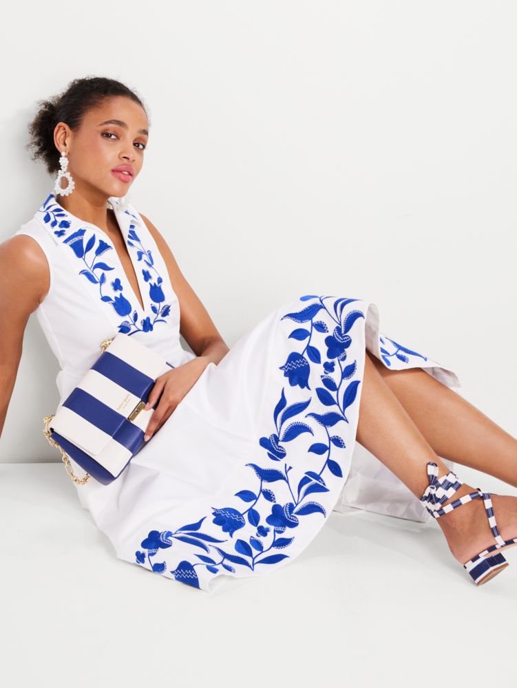 Exceedingly elegant: May we just say that you'd look absolutely divine in this midi dress, embroidered at the collar, neckline and hem with this season's zigzag floral motif.