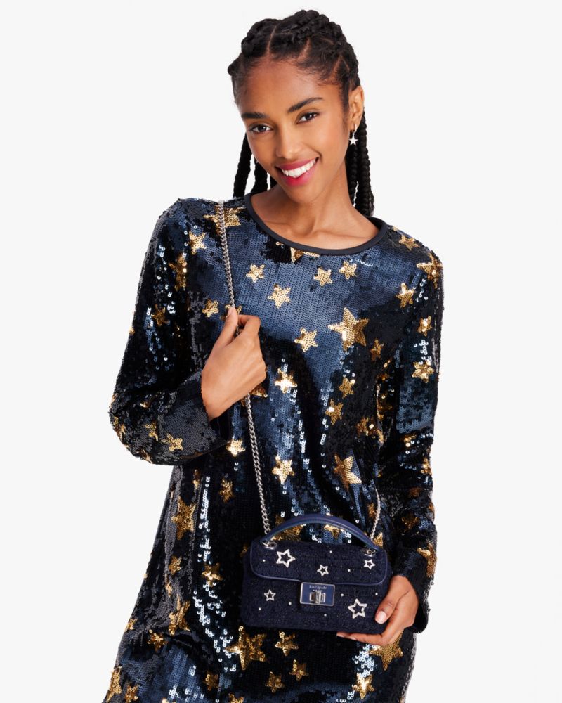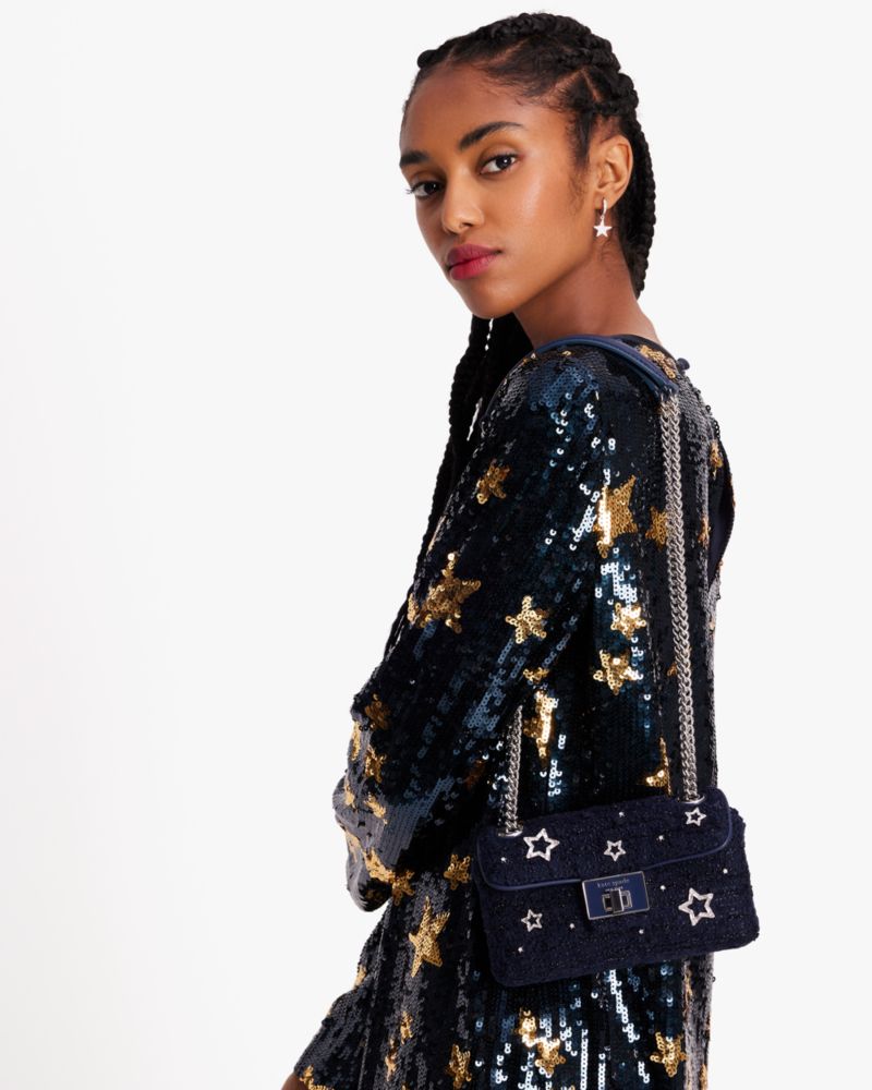from star-studded tweed, it features convertible chain straps