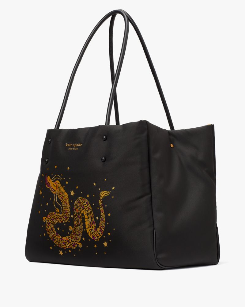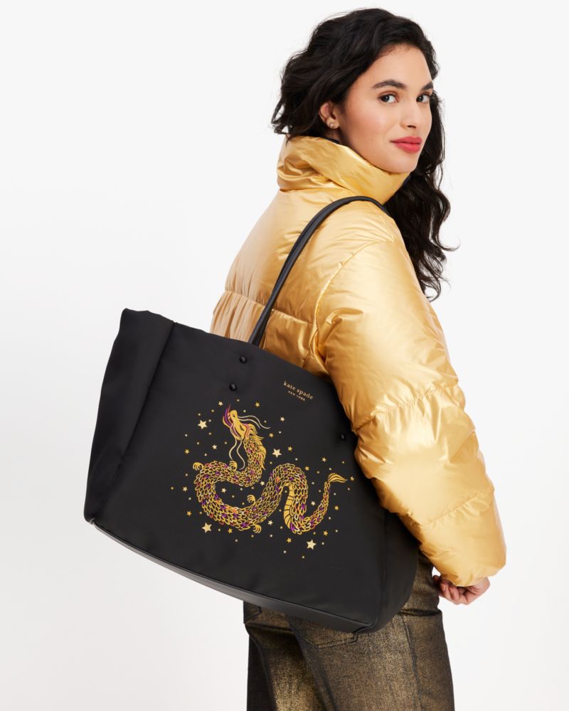 ABMESSUNGEN, Höhe: 31,8 cm, Breite: 38,1 cm, Tiefe: Tragelänge des Griffs: 0 cm 21 cm, EIGENSCHAFTEN: Tragetasche mit offener Oberseite, Einschubfach innen, Reißverschlusstasche innen, Drachenverzierung, mit Stift befestigtes Logo, Portemonnaie im Querformat mit Rundumreißverschluss, mit Platz für das aktuelle iPhone, iPad, DIN-A4-Ordner, 13-Zoll-Laptop, MATERIALIEN: Jacquard mit Rand aus glattem Leder, Faille-Futter, importiert, Produktcode: KE932