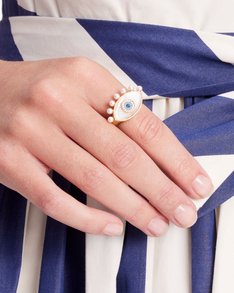 Our new ring bracelet adds a cool pop of sparkle to your summertime looks. This style features the Evil Eye, a culturally treasured symbol of protection.