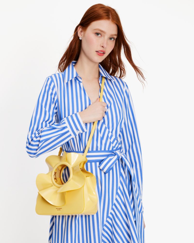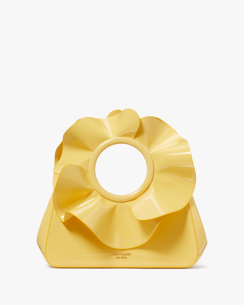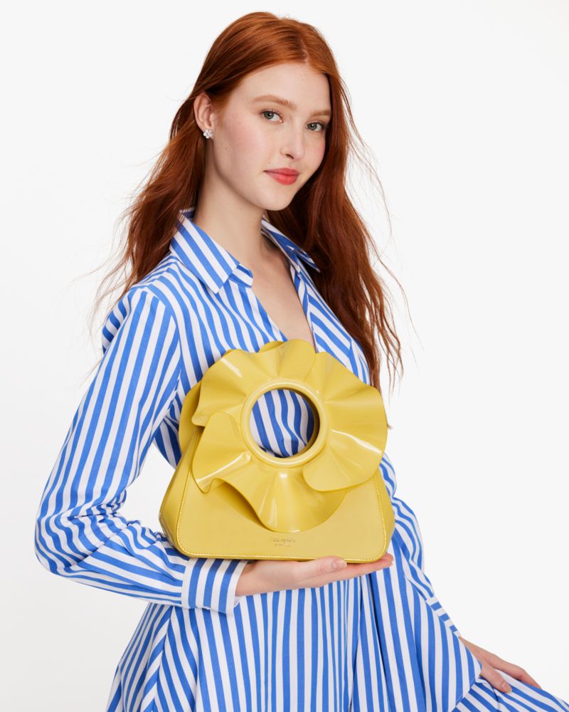 Our new crossbody is in bloom. Made from faux patent leather, this springtime style features a floral handle that doubles as a bracelet (just put your wrist through it!).