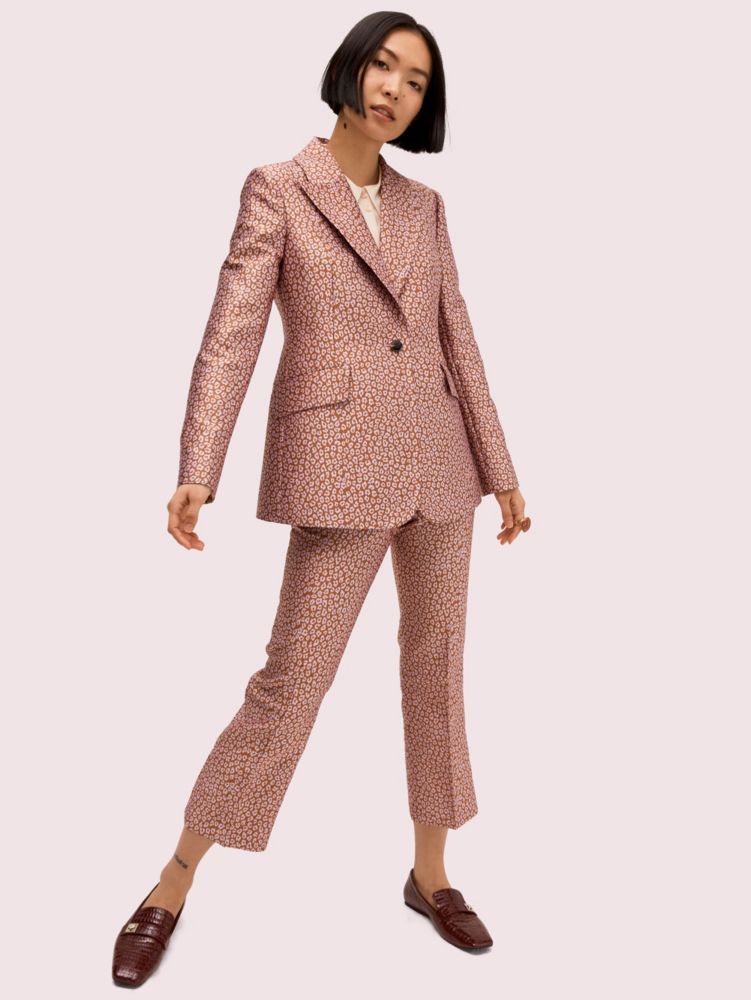 these eye-catching trousers made their first appearance on our fall 2019 runway. jacquard-woven with our flora leopard pattern, this polished pair stays true to its menswear roots with creased legs, quarer-top and welt back pockets. the high rise and wide-leg silhouette add a flattering, feminine touch. pair it with a blazer and a knit polo like we did on the catwalk.