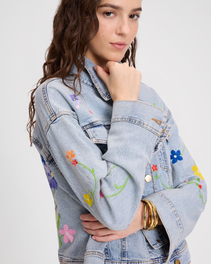 Chilly spring days call for this oversized jacket, made from light wash denim with colorful floral embroidery.
