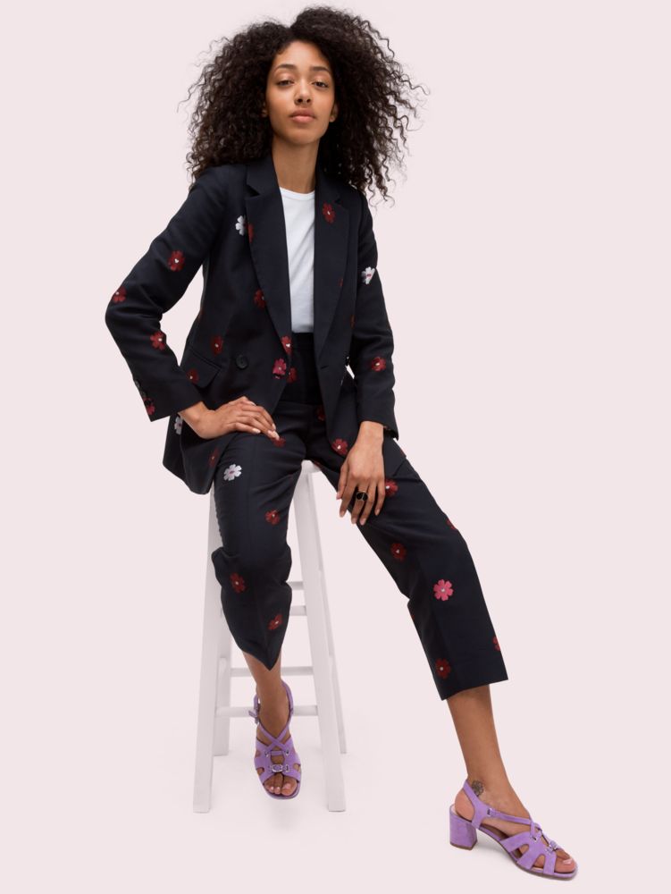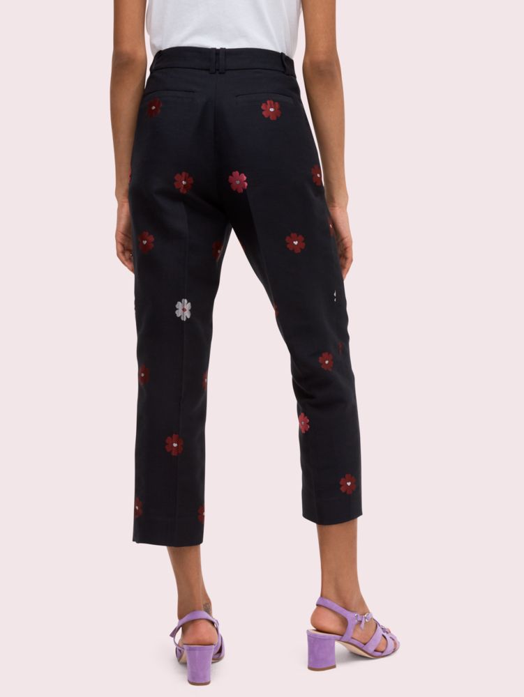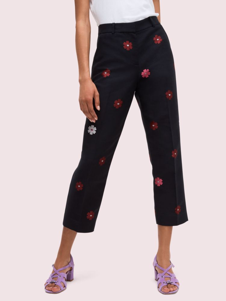 this is one piece of what we call a flower power suit. these smartly tailored cropped pants have a classic fit and are made from jacquard for a hint of stretch, then covered with pretty blossoms. look closely and you'll see that the center of each flower is either a tiny pair of lips or a heart. because you know we love a hidden wink. pair them with the matching blazer. they look just as chic with a crewneck sweater, too.