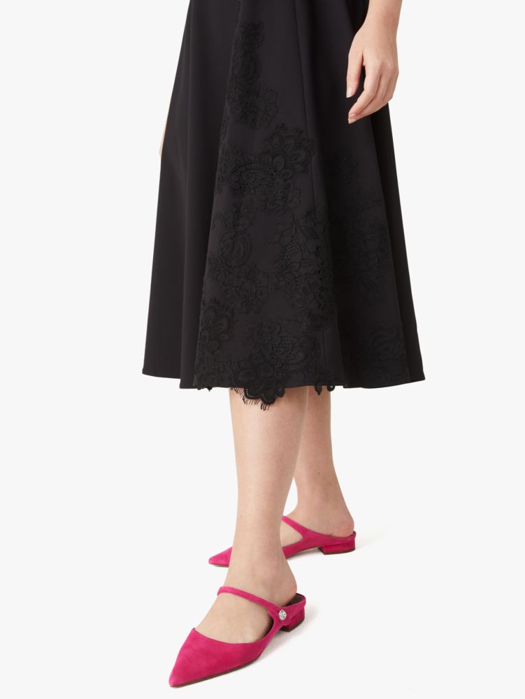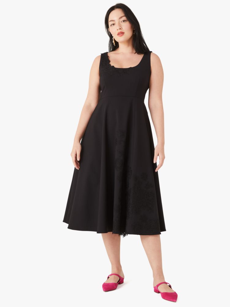 the genius is in the details: of course we love this stretch cotton-blend dress for its flattering fit-and-flare style, but if you look at the bodice, you'll notice something particularly special: floral lace appliqués.