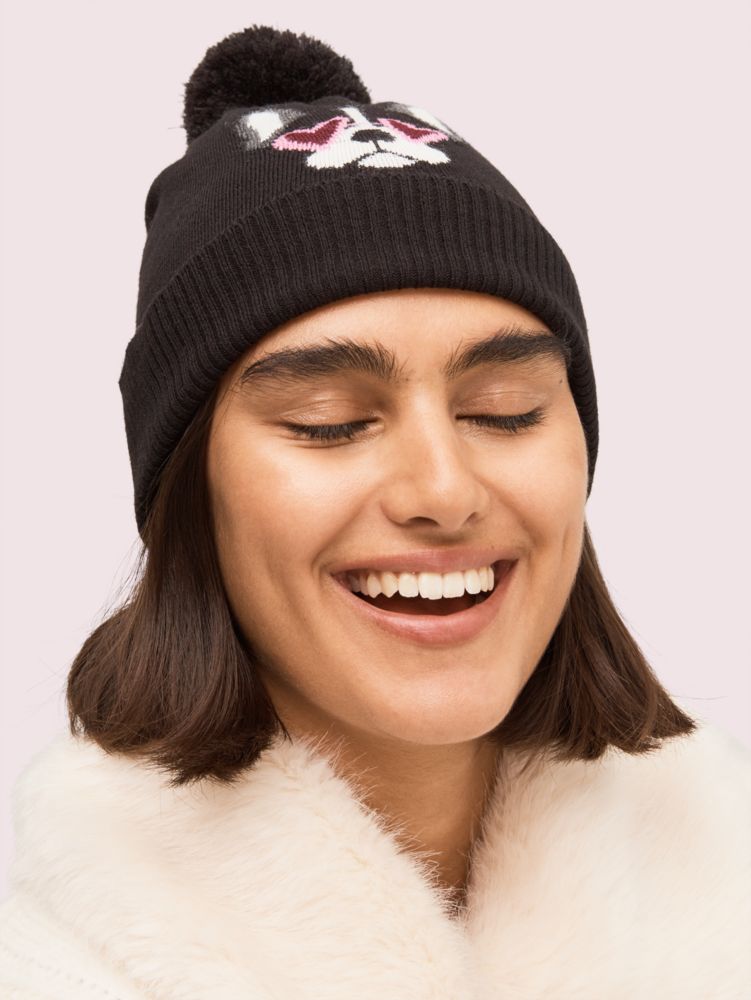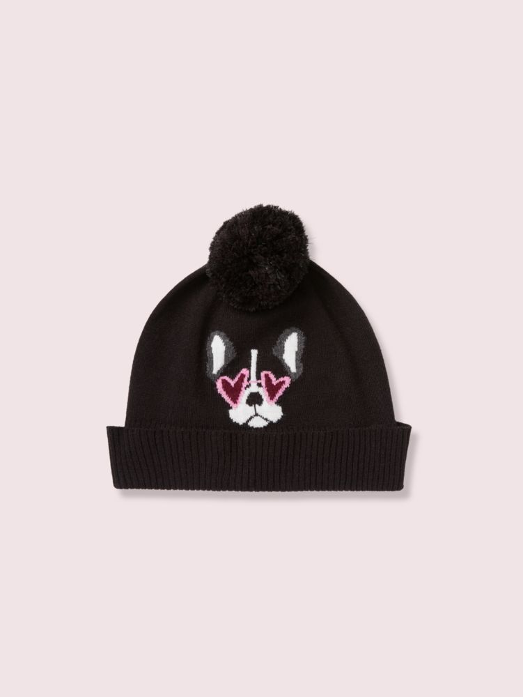meet francois: he's our french bulldog friend you might've seen on some of our clothing and handbags for fall. we reimagined him on this stockinette-stitched beanie, and topped him off with a stylish pair of pink heart-shaped shades.