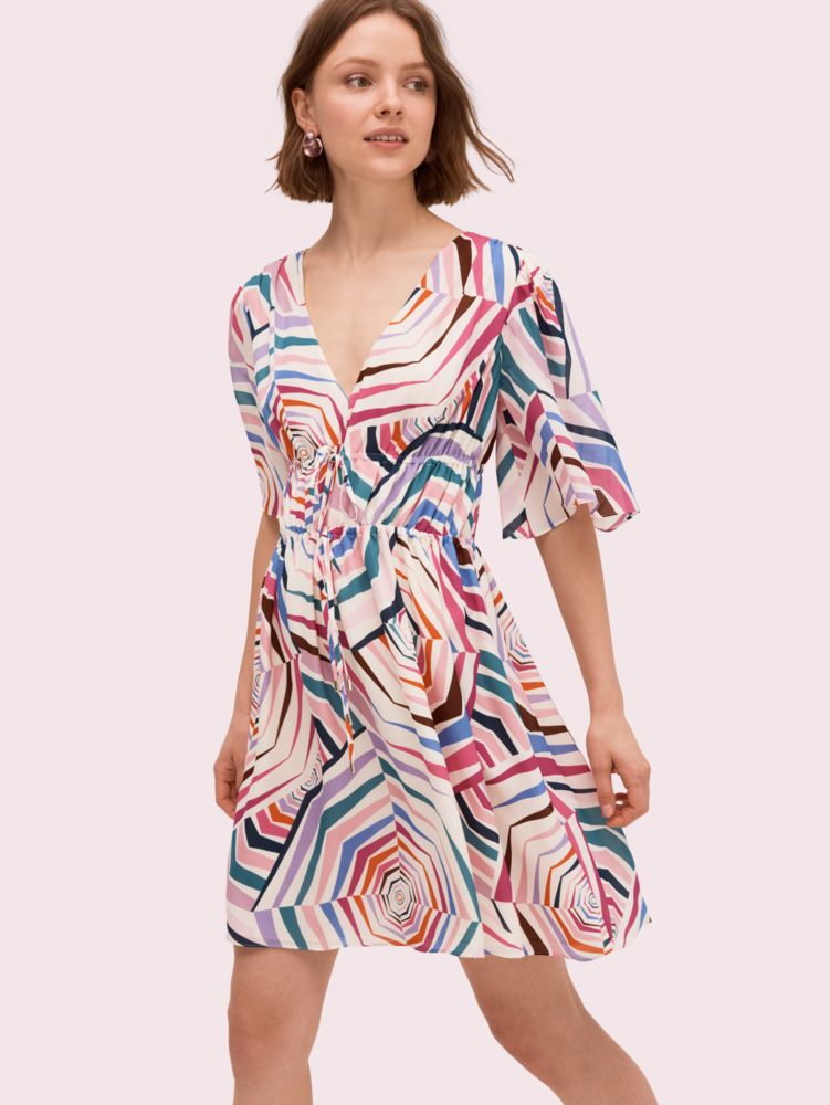 we were dreaming about warm getaways when creating the geobrella print on this silk georgette dress. if you look really closely, you'll notice the colorful pattern is made up of the tops of beach umbrellas. another thing we love about this piece? the ties around the waist allow it to be adjusted to the perfect fit-and-flare silhouette; and ensure it's not too tight or too loose. it'll make for a pretty dinner look or beach cover-up on your next vacation.