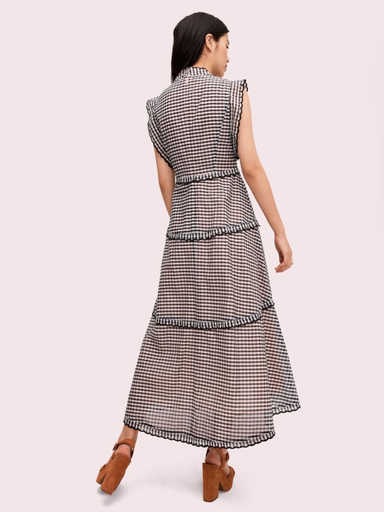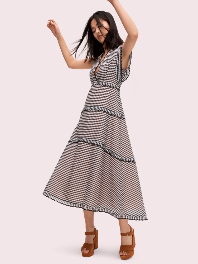 we're forever fans of gingham so we printed it on a slim, slightly sheer midi dress that is as preppy as it is va-voom. then we dialed up the femininity by adding delicate tiers and pretty scallop topstitching. an effortless choice for summer parties, brunch, the park and, we think you'll discover, everywhere.