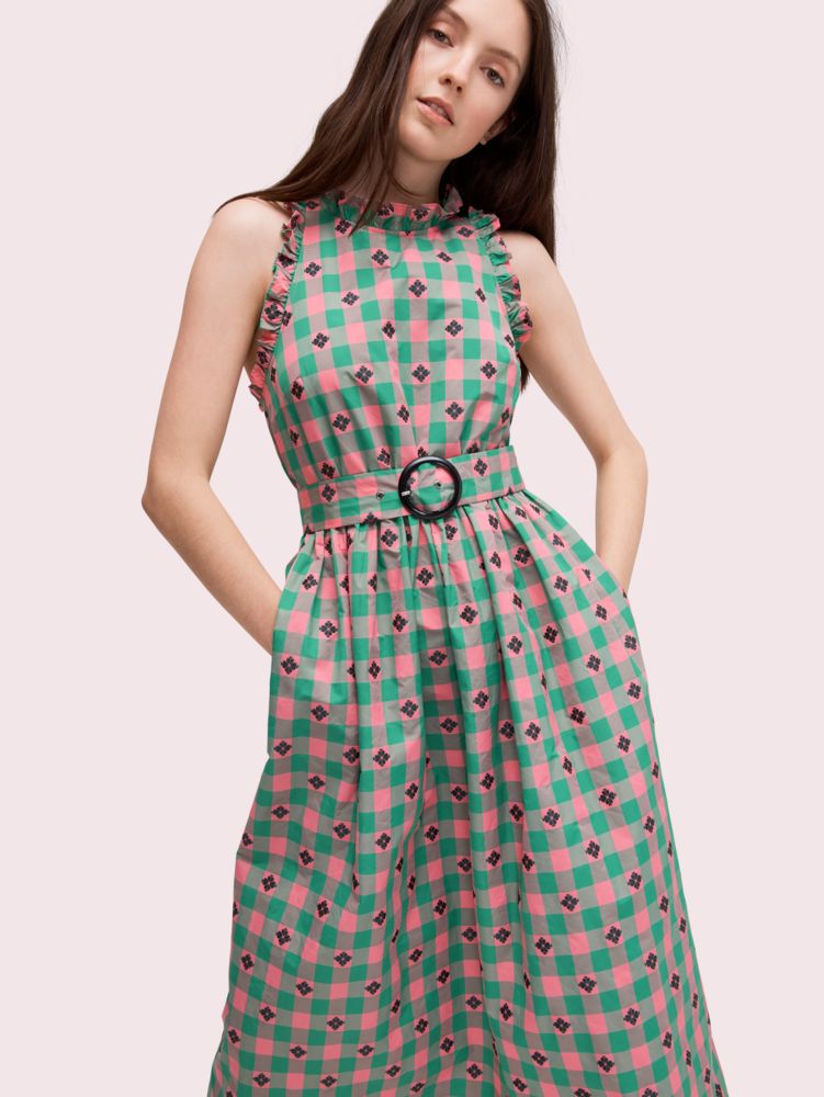 can we talk about the shape of this fit-and-flare midi dress for a minute? we think the ruffled top and belted waist create an ultra chic silhouette. look closely at the pretty gingham print: do you see our signature spades embroidered throughout? we love this dress so much we put it in our spring 2019 campaign.