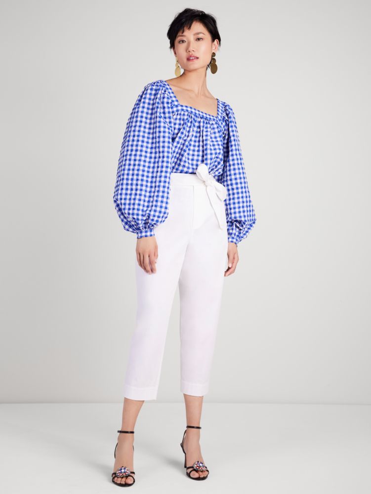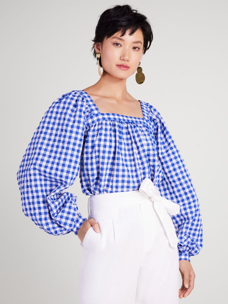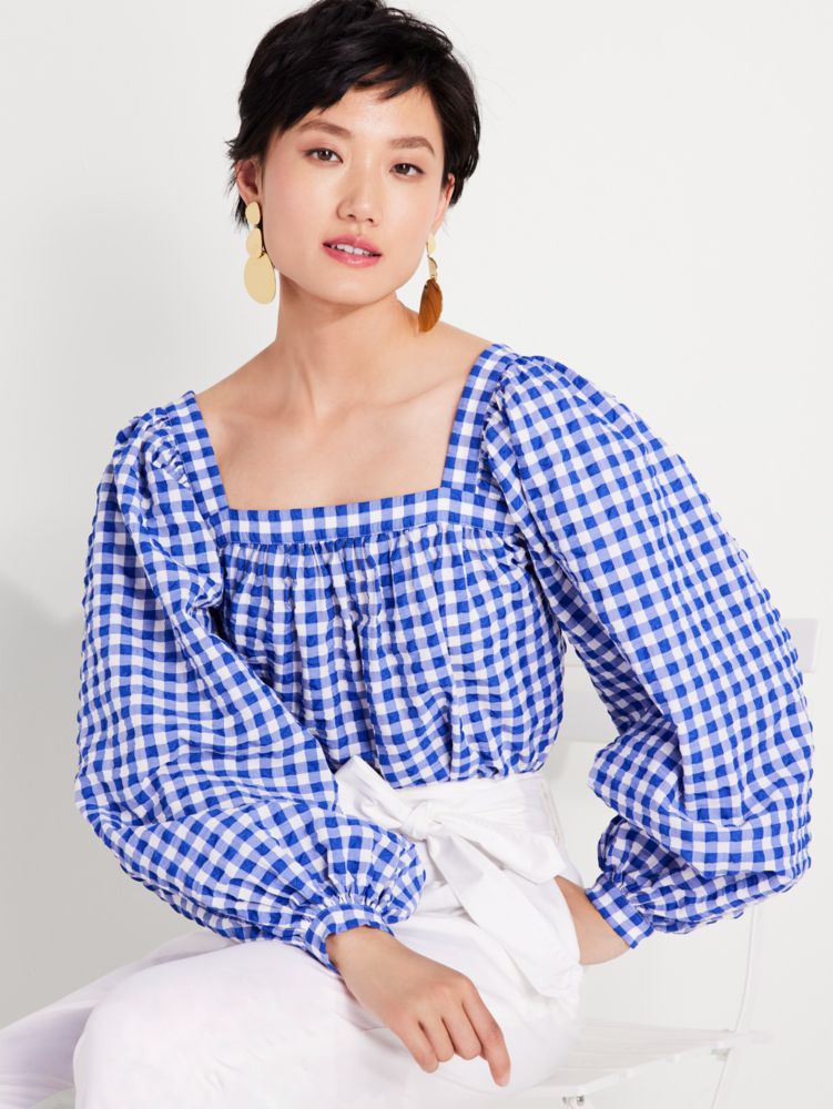 Gingham is a summer must. Add the essential print to your closet with this top, featuring a chic square neck and long blouson sleeves.