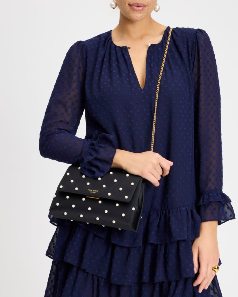 Meet Grace. Done in smooth satin with faux pearl embellishments, this clutch is equal parts structured, chic and endlessly versatile.