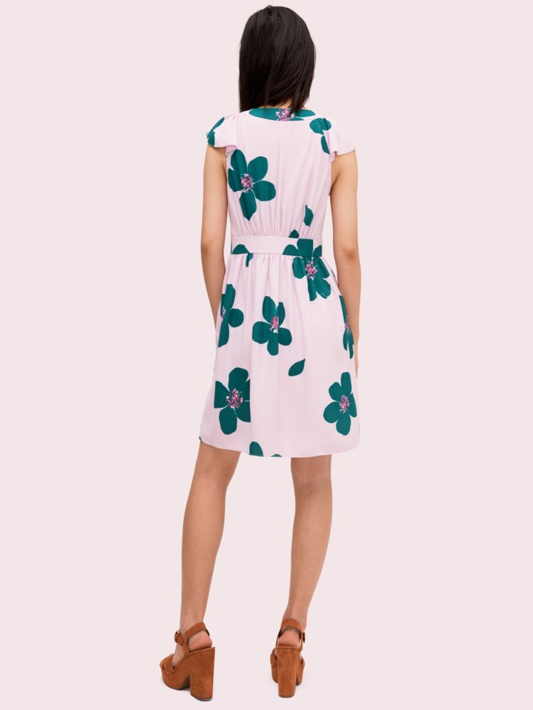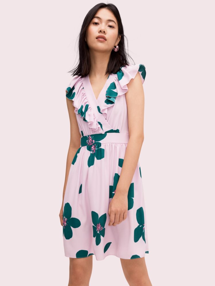 this is our grand flora print. it comes in so many pretty color combos and has us very excited for warm weather. we think it looks extra nice on this a-line mini dress' crêpe de chine fabric. but there are so many other things to love about this piece. like the ruffled v-neck and flutter sleeves that add a little bit of texture. we see you wearing this with strappy sandals and your favorite leather crossbody.