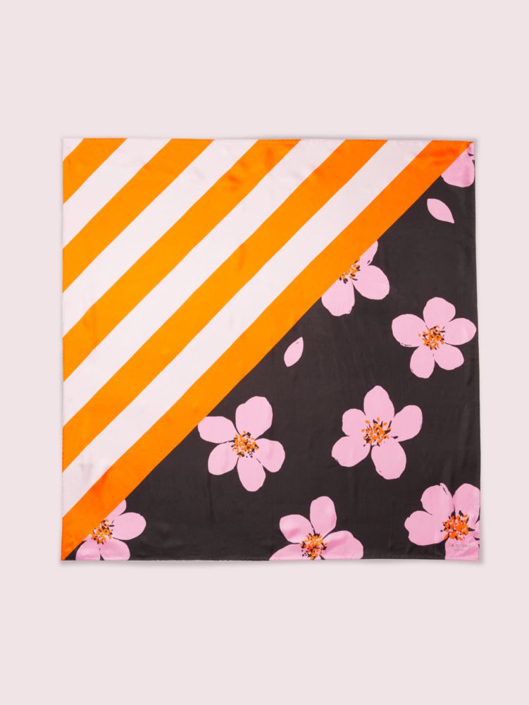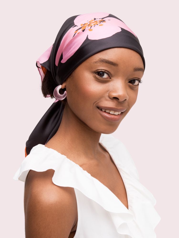 this square scarf is made from 10mm silk and features our grand flora print in the prettiest color combos. some other thoughtful details you should know: it's designed with hand-rolled hems and accented with a gold foil logo. we love it wrapped around our hair, our favorite bag...