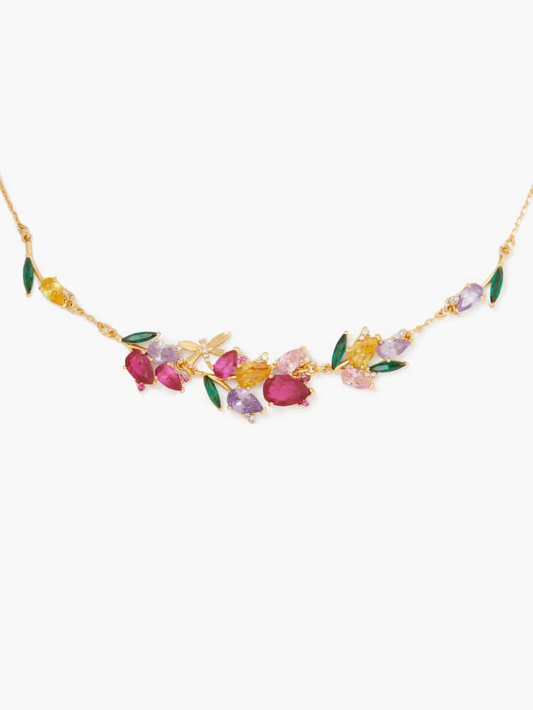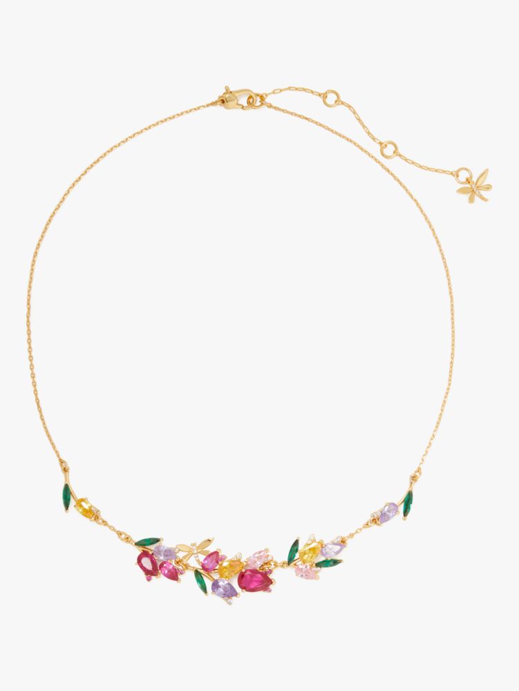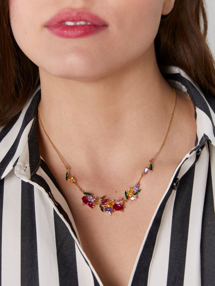 Made from shiny polished metal and colorful crystals, this floral necklace can be cherished for years to come...no watering needed.