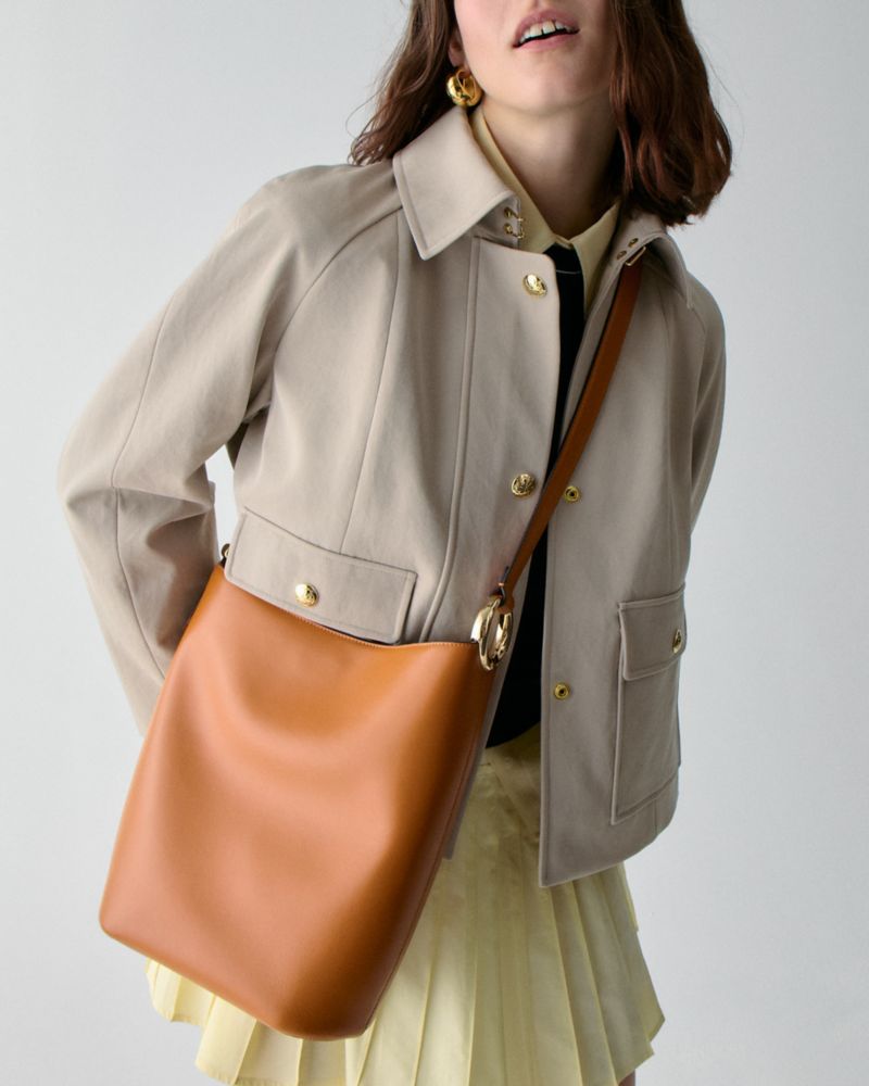 Our Halo collection is named for its unique ring-shaped hardware—an archival detail that dates back to Kate and Andy Spade's early days in business. This fine grain leather bucket bag features an adjustable strap, allowing you to go from crossbody to your shoulder in a snap.