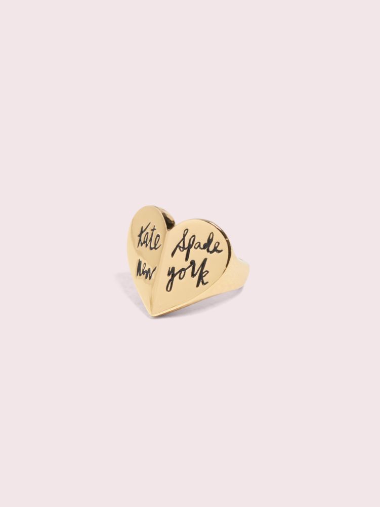 this is our heritage spade heart ring. we first introduced it in our spring 2019 campaign with an enamel surface in a range of shades. this season, we updated it to solid gold-plated metal and etched our logo in pops of colors. pick your favorite hue and match it to your outfit, handbag, scarf...anything your heart desires.