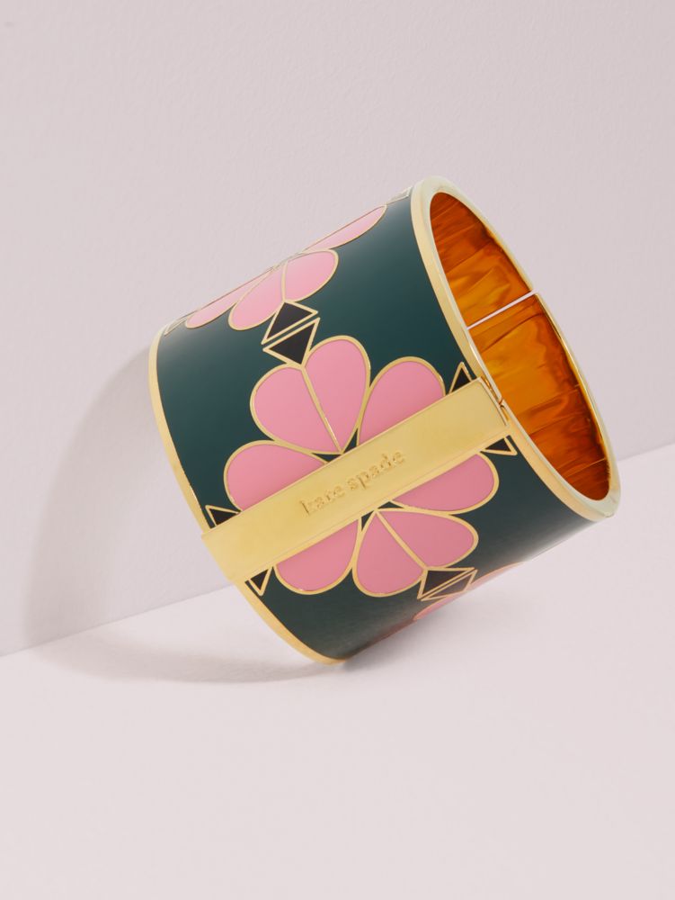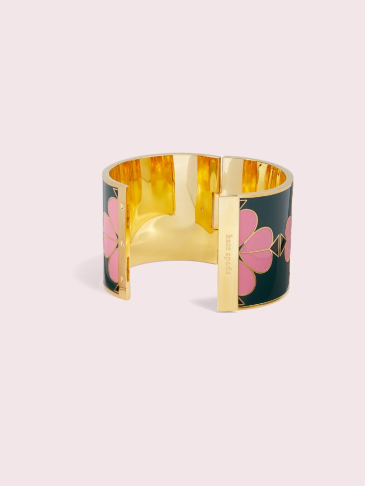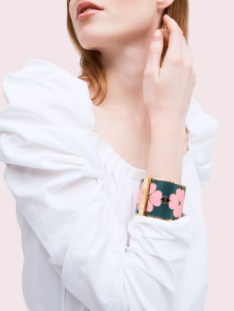 youve probably seen the new floral motif we created by joining four spades together like leaves of a clover. its on everything this season--handbags, dresses, and of course bangles. we especially love how bold this wide version looks here in lacquered enamel. its made for stacking too, so dont be shy.