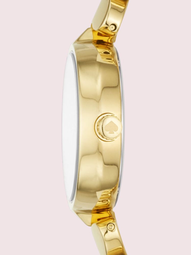 detailed with a slender, gold-tone stainless steel bracelet, our 24mm hollis watch features a white mother-of-pearl face punctuated with sparkling crystal indexes. the heart-shaped links are a charming twist on a timeless piece.