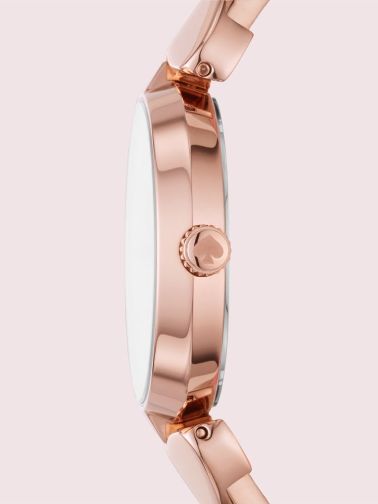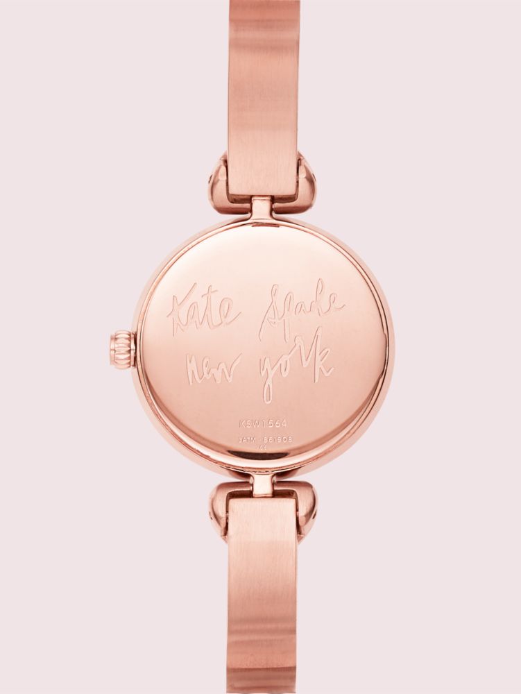 our 30mm hollis watch might look simple, but it has so many thoughtful details that make it unique. to start, the rose gold-tone numerals and pink glossy face that catches the light nicely. but also: the rose gold-tone lugs connecting the red enamel stainless steel bangle. they're in the shape of our signature spade.