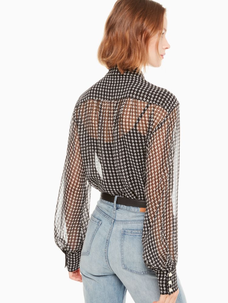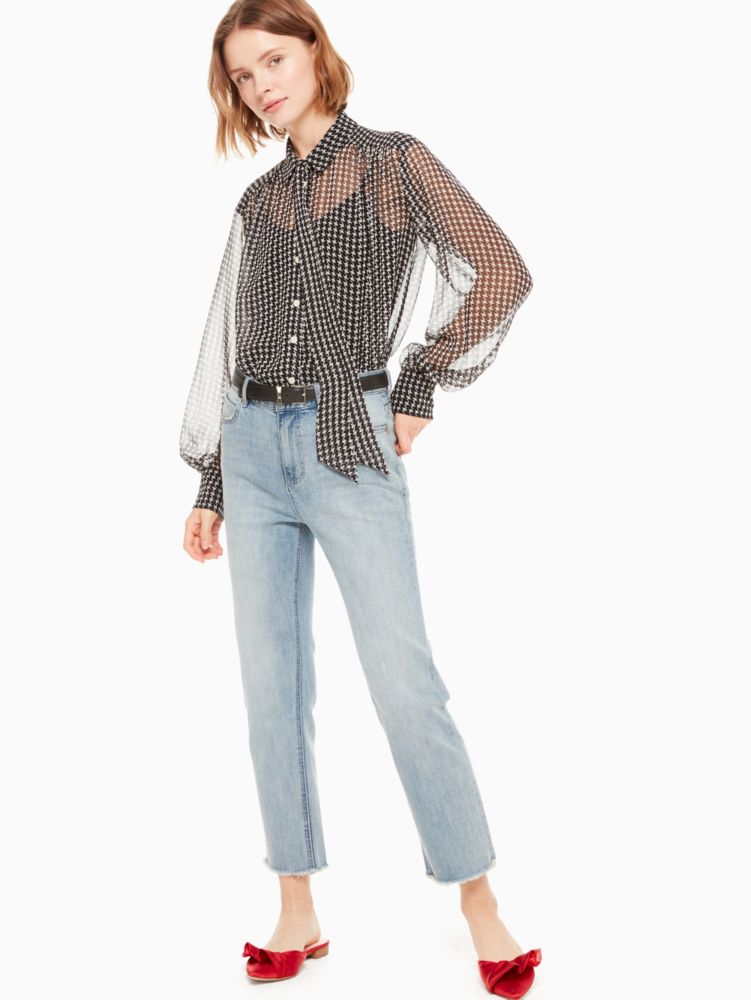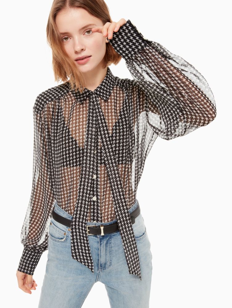 our houndstooth chiffon blouse has a fluid fit with refined bow-tie at the neck. tuck it into jeans, or dress it up with trousers or a pencil skirt.