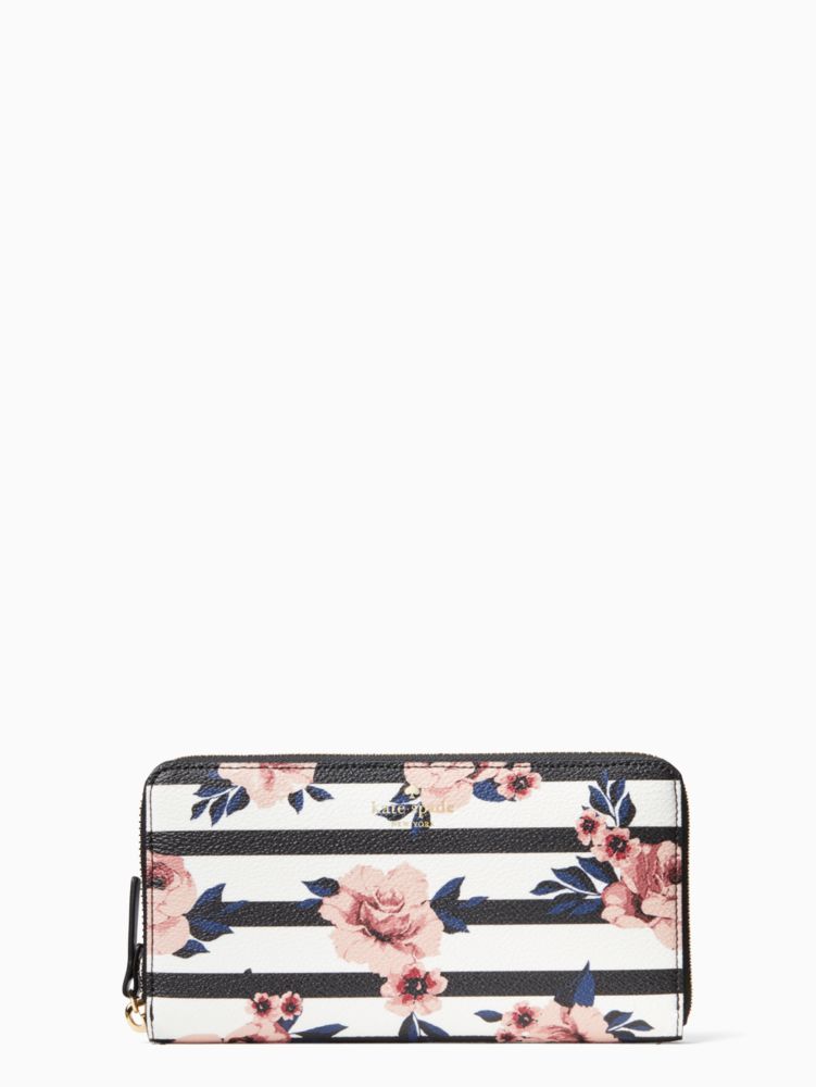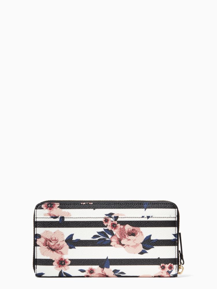 with a pretty rose pattern against graphic stripes, there's a lot to love about our lacey wallet--including 12 card slots, 2 billfold compartments and one middle zip pocket, to be exact. the finishing touch? an outside slide pocket for holding metro cards, to-do lists or tickets close at hand.