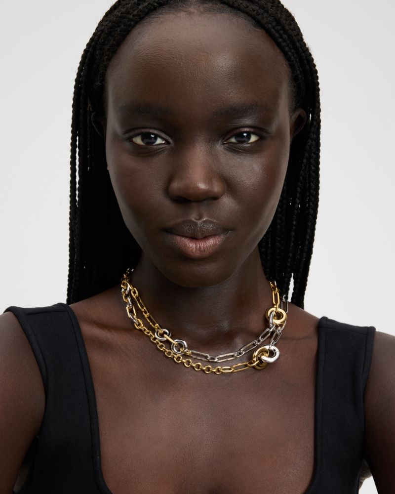 Designed with interlocking links, our new long necklace makes a bold, metallic statement.