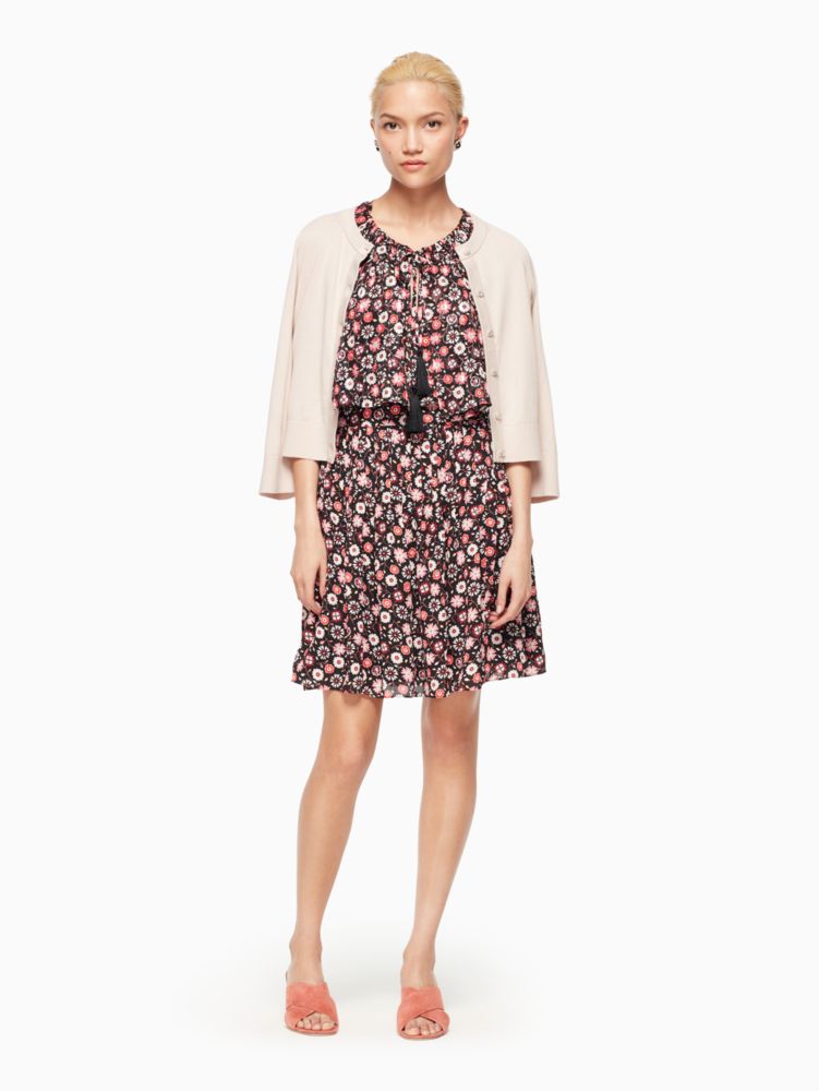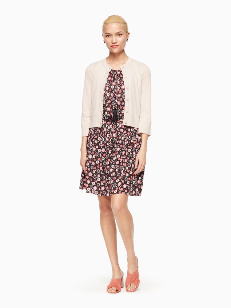 a cropped bracelet-sleeved cardigan with bejeweled buttons, this simple sweater pairs perfectly with everything from tank tops to cocktail dresses.
